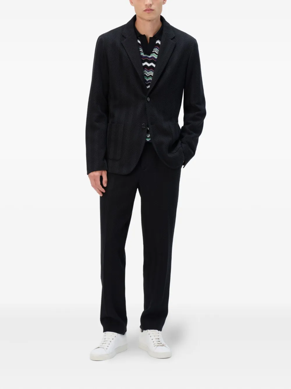 Черный, с узором «елочка», прямой крой, плоские передние и боковые карманы. Полученный вами товар может немного отличаться от представленного на фотографии. Это связано с тем, что все изделия Missoni изготавливаются вручную.
