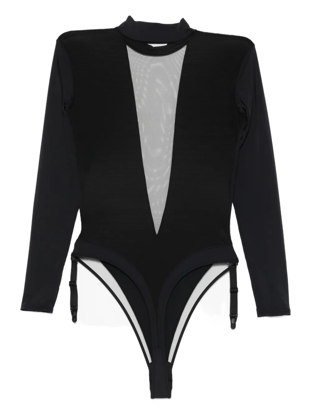 Черные стринги с длинными рукавами и сетчатыми вставками. Напоминаем, что эту вещь следует примерять поверх собственной одежды.