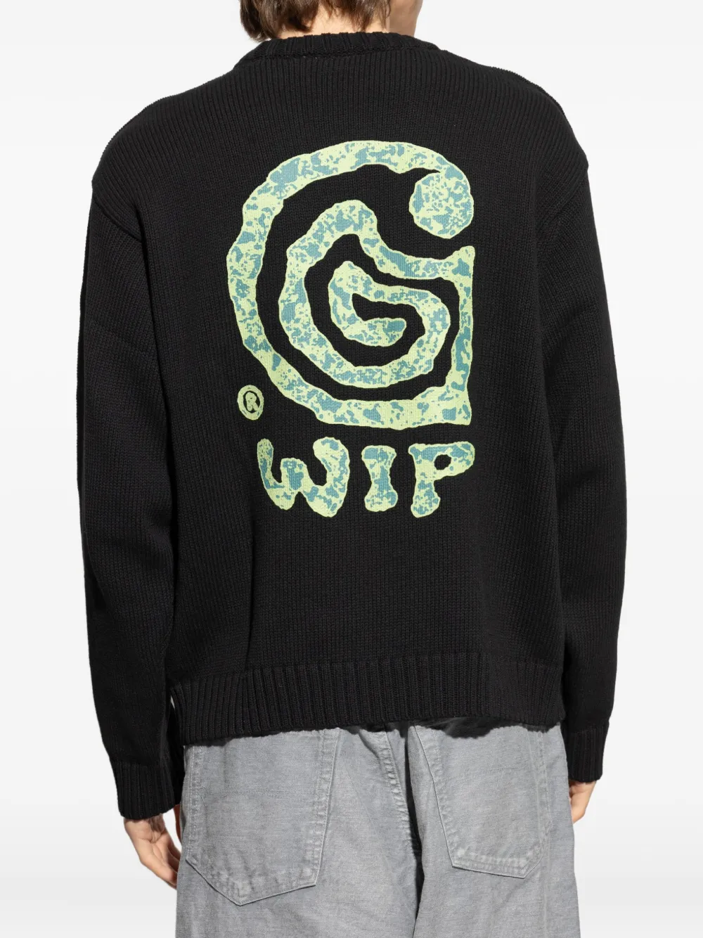 Черный ребристая вязка с круглым вырезом и вышитым логотипом, графический принт на спине