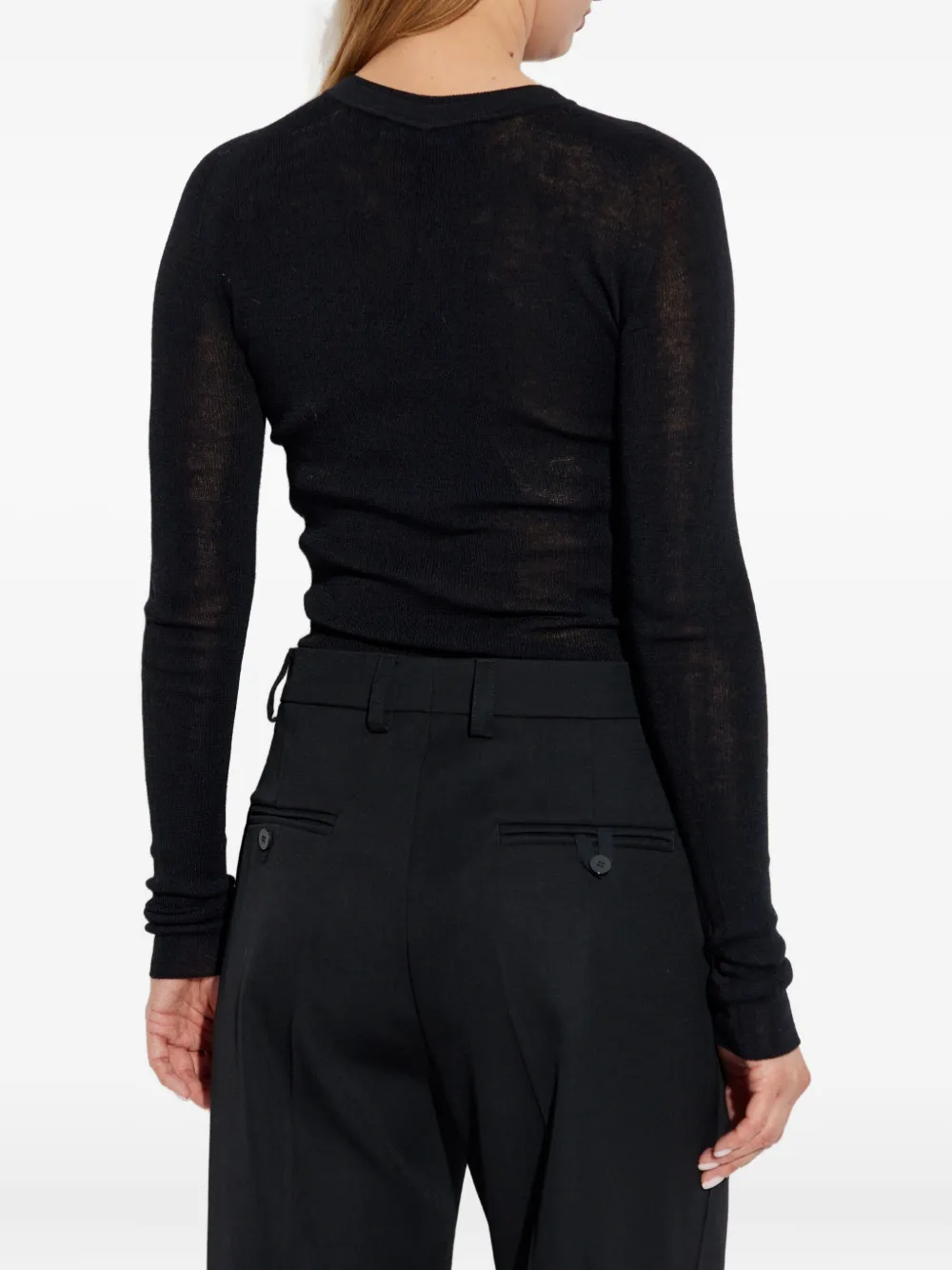 Черная ребристая текстура, длинные рукава, круглый вырез, короткая застежка на пуговицы спереди