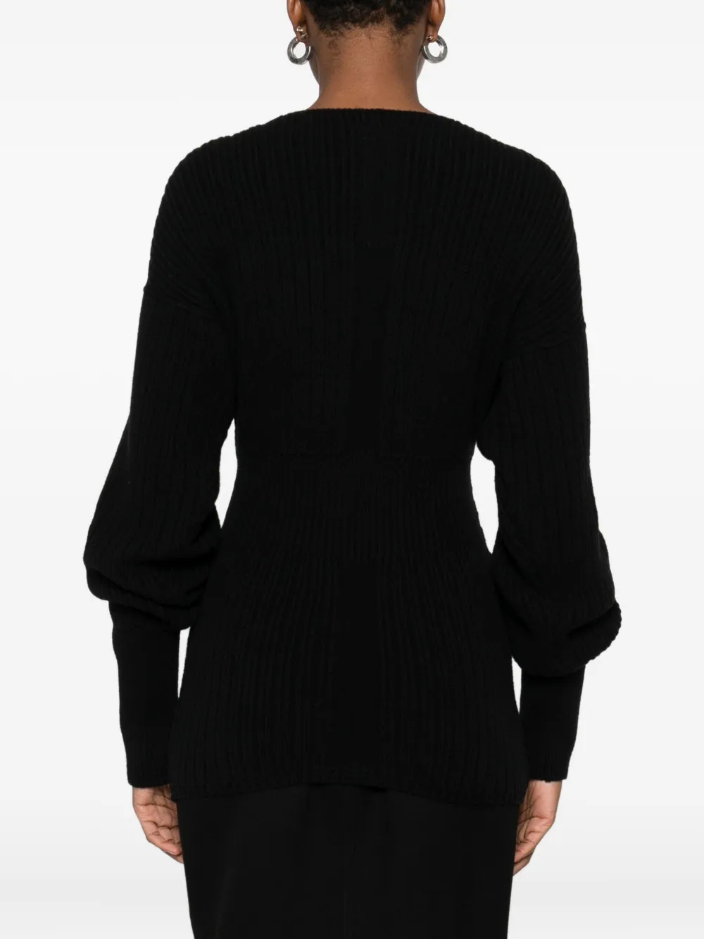 Черный ребристый трикотаж с V-образным вырезом и длинными рукавами