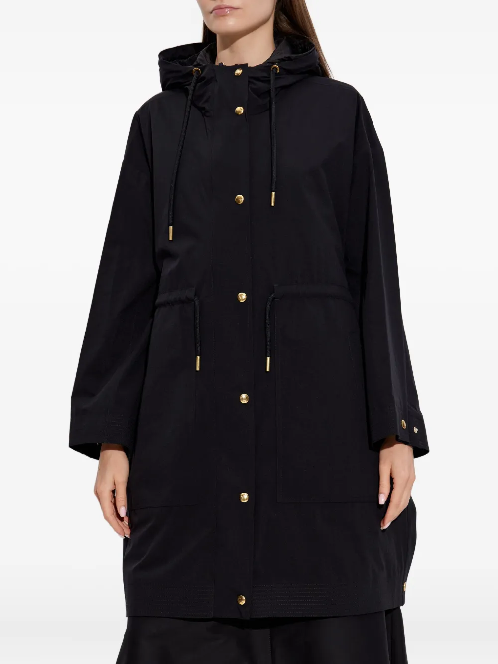Черный шнурок на талии, затягивающийся шнурок, капюшон спереди, застежка на кнопку и молнию, длинные рукава