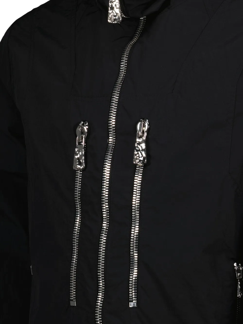 Черный фиксированный капюшон, застежка-молния, серебристые бегунки-молнии, боковые карманы на молнии, длинные рукава