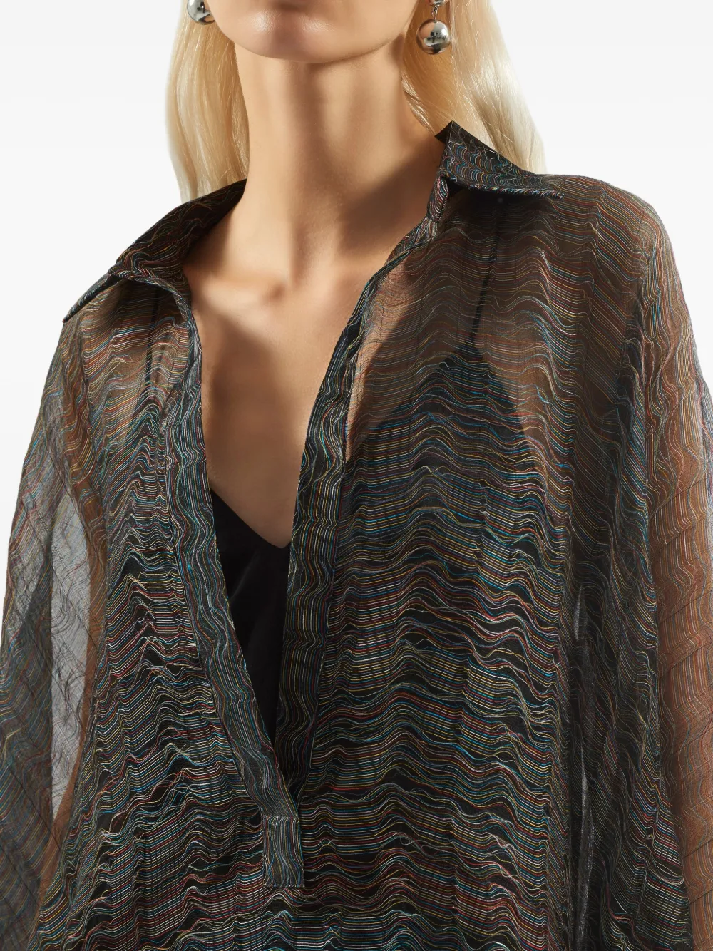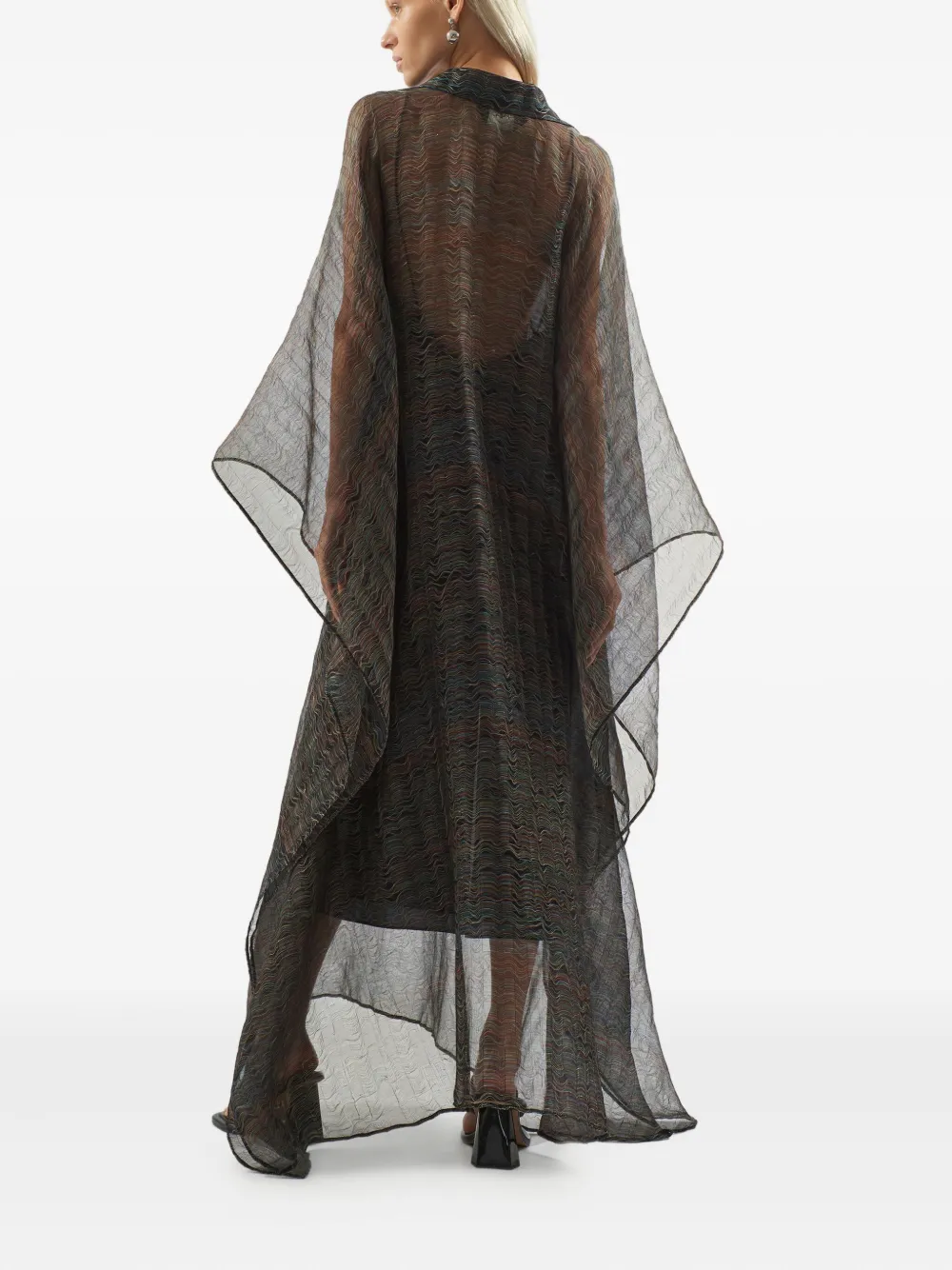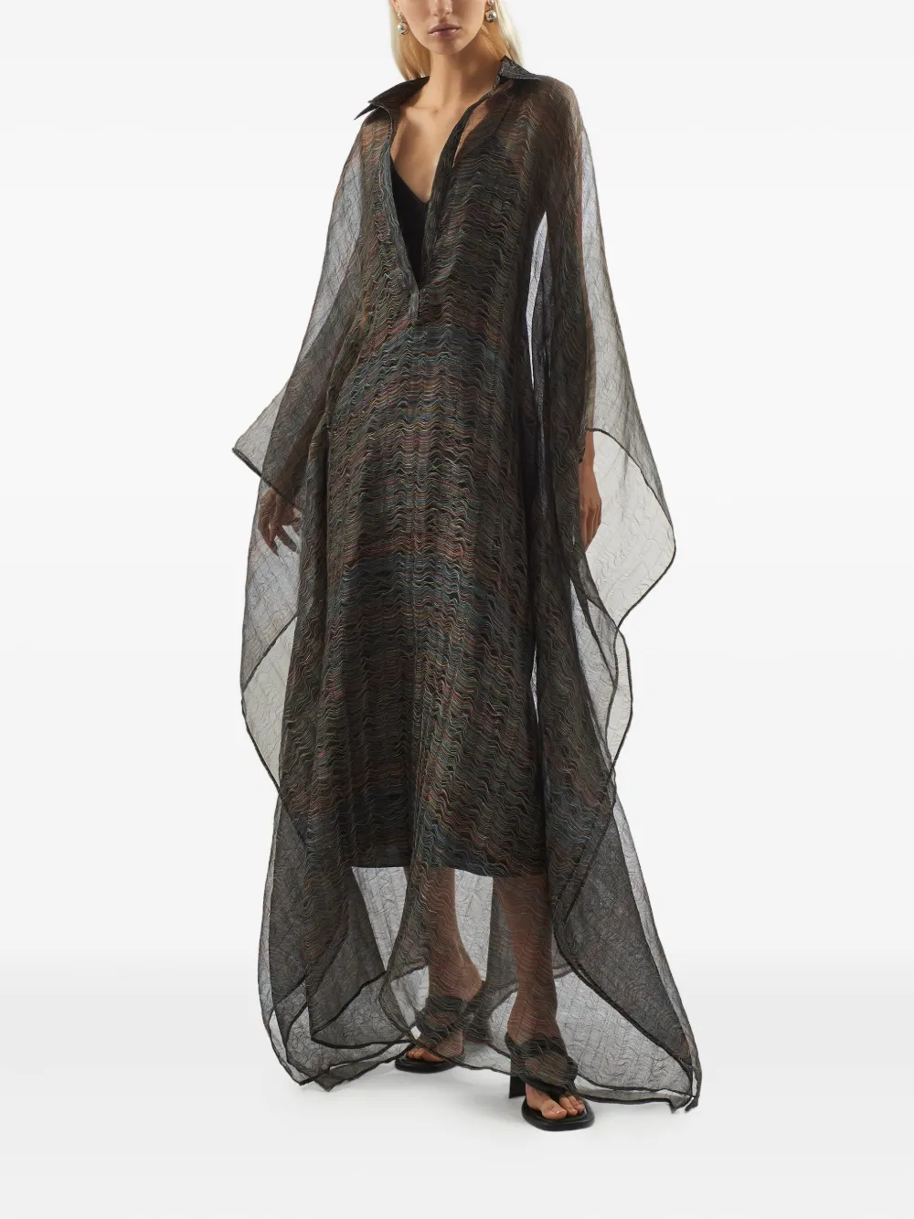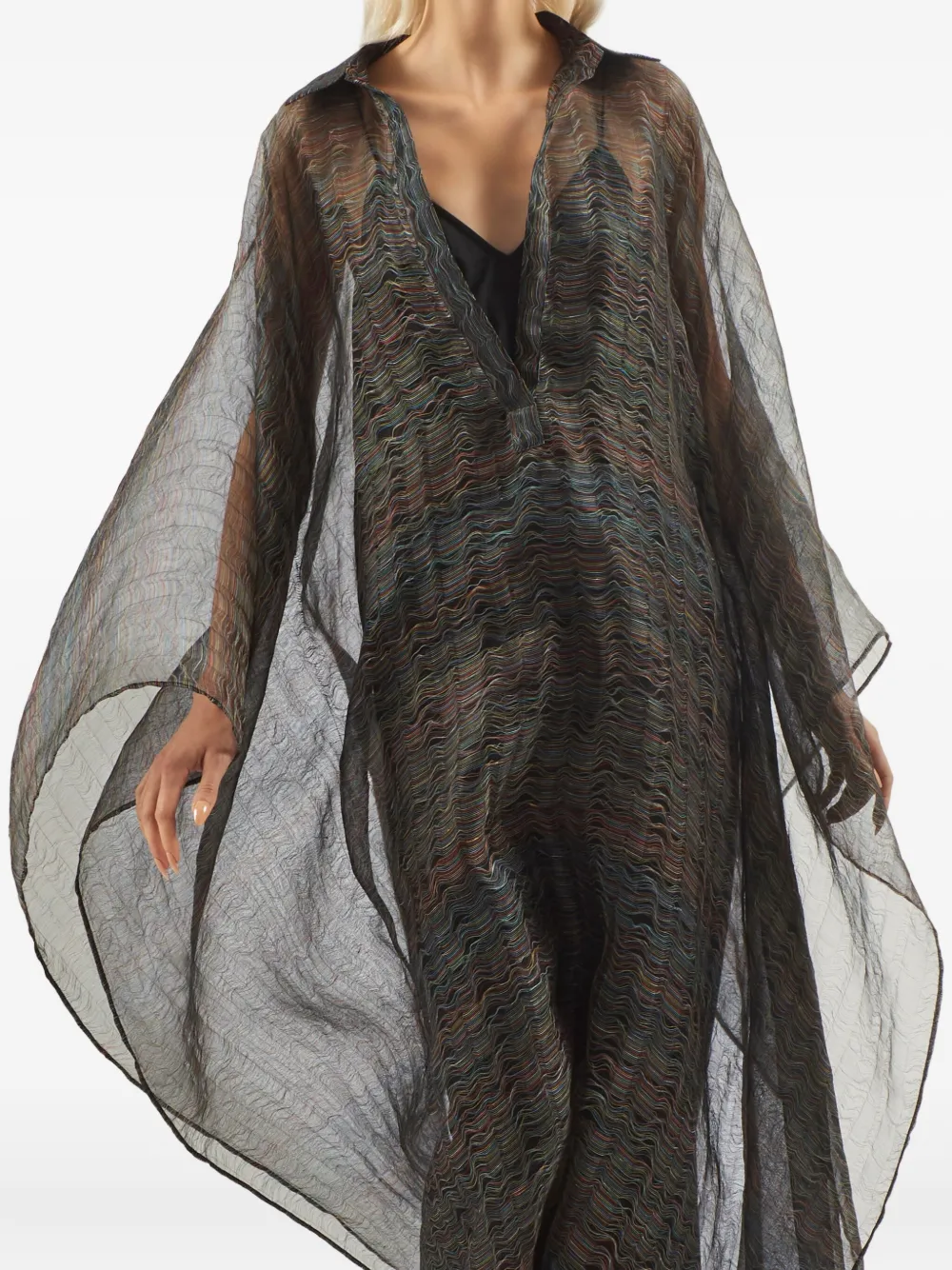 Черная прозрачная ткань, воротник-стойка, широкие рукава, асимметричный подол