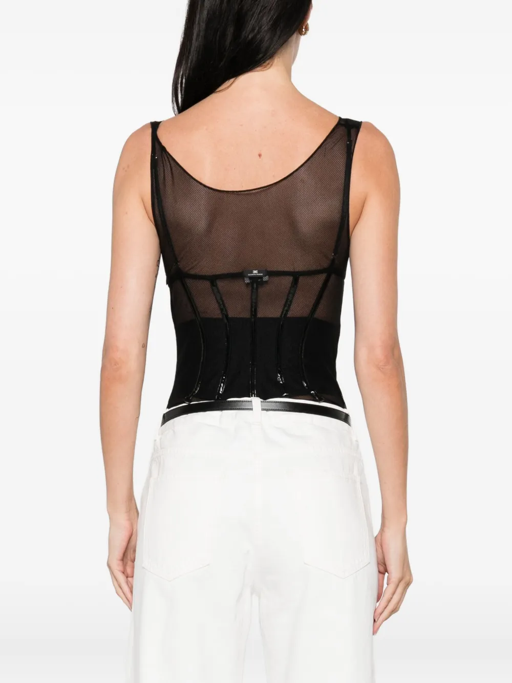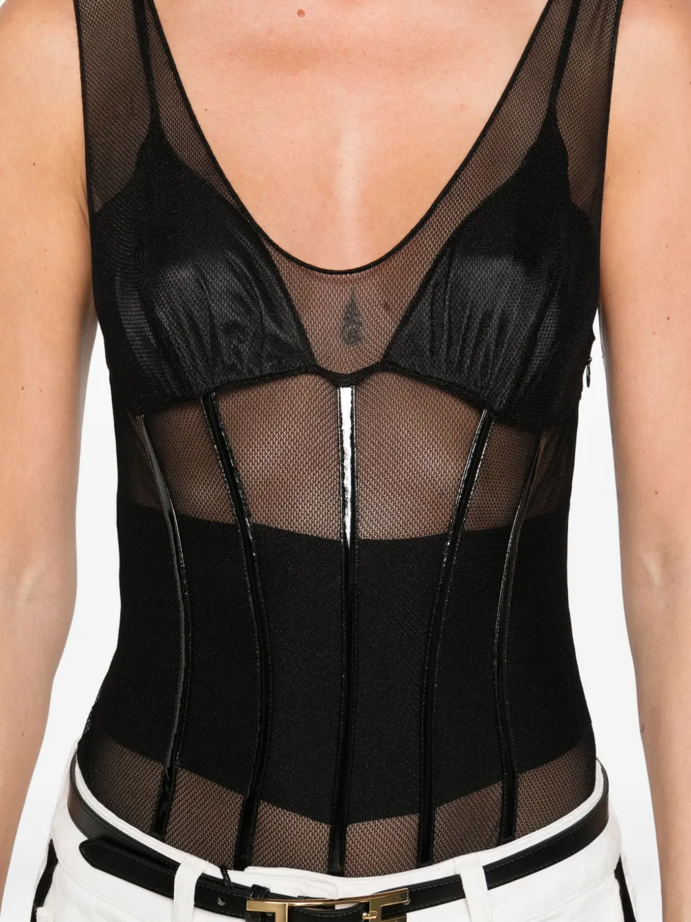 Корсет с черными сетчатыми вставками, без рукавов. Напоминаем, что эту вещь следует примерять поверх собственной одежды.