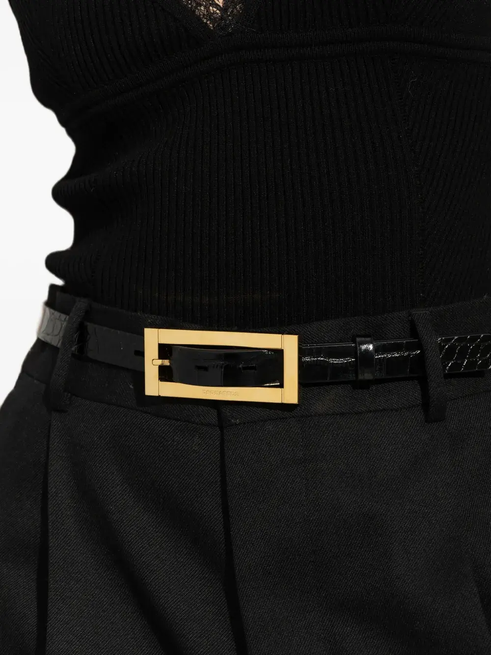 Черная кожа с эффектом крокодила, прямоугольная пряжка, золотистая фурнитура, пробитые отверстия