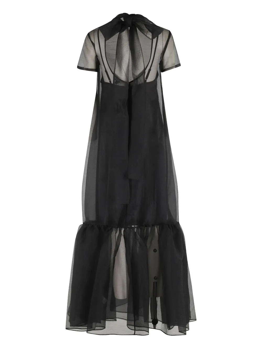 Черные оборки, полупрозрачная конструкция, короткие рукава, воротник-стойка