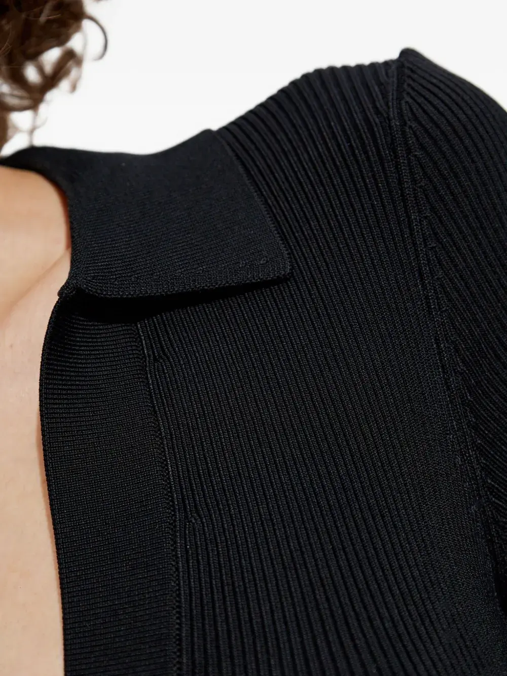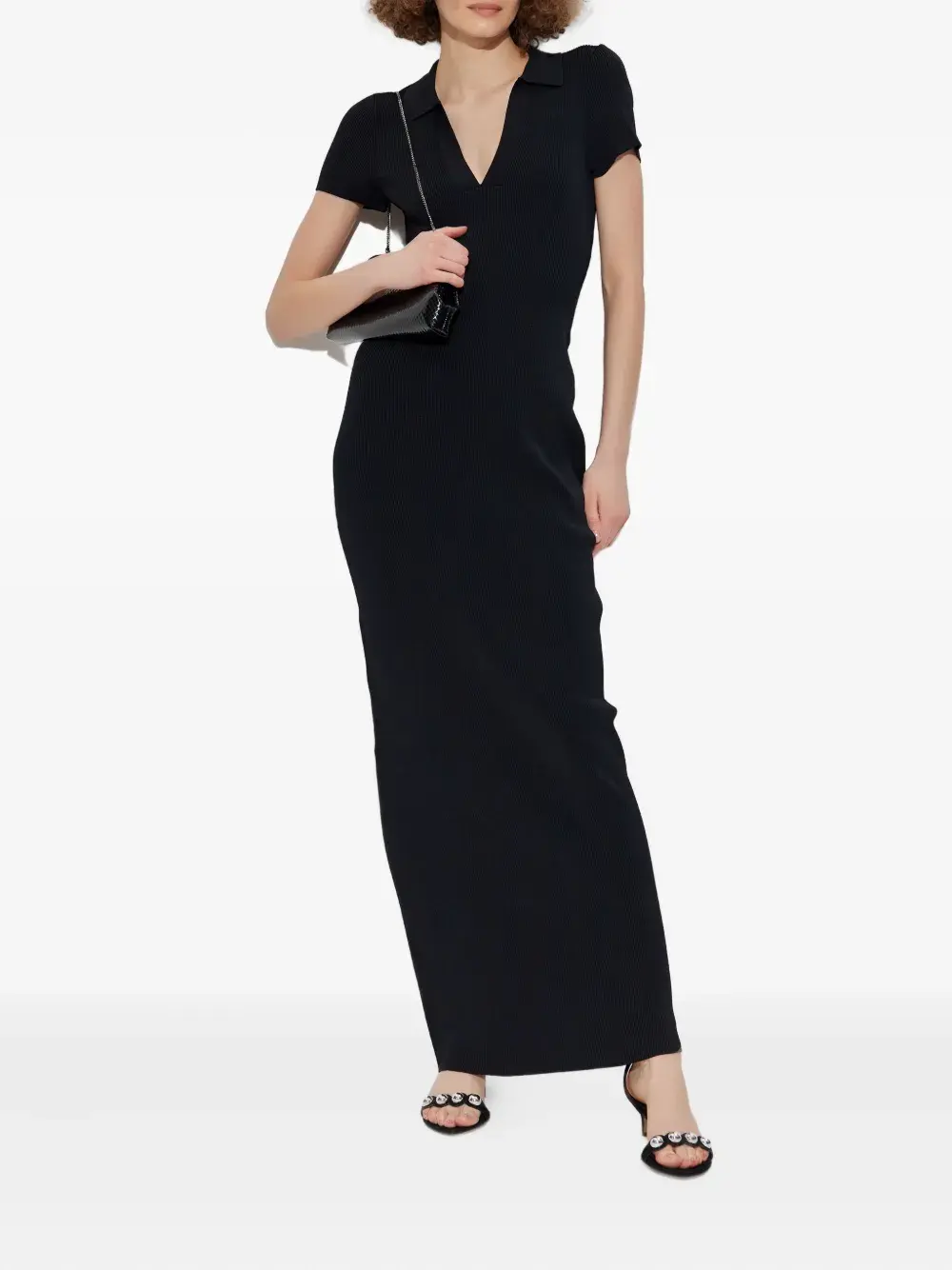 Черный воротник-поло, короткие рукава, ребристая текстура, длина макси