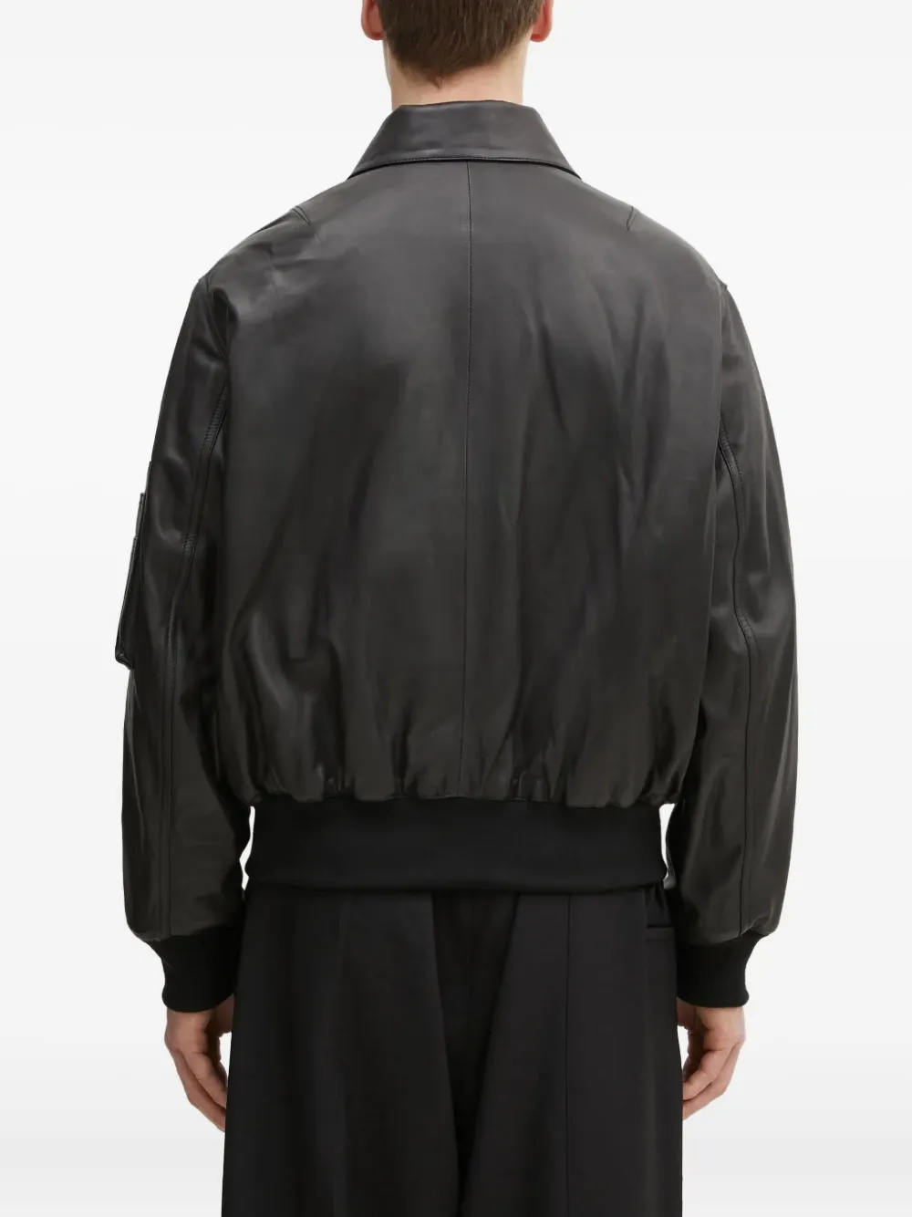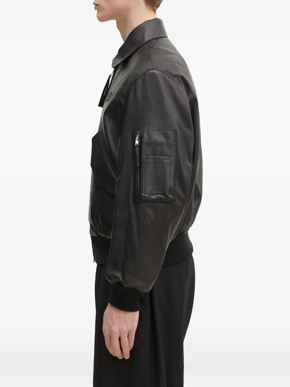 Черная кожаная конструкция, застежка-молния, карманы с клапанами, нашивка с логотипом на груди