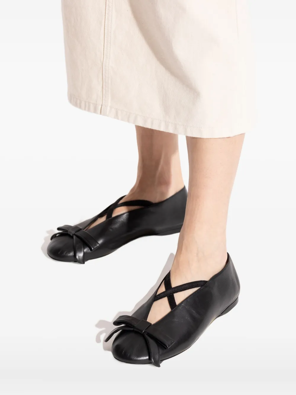 Верх из черной кожи, V-образный мысок, перекрещивающиеся ремешки, закругленный носок, декоративный бант