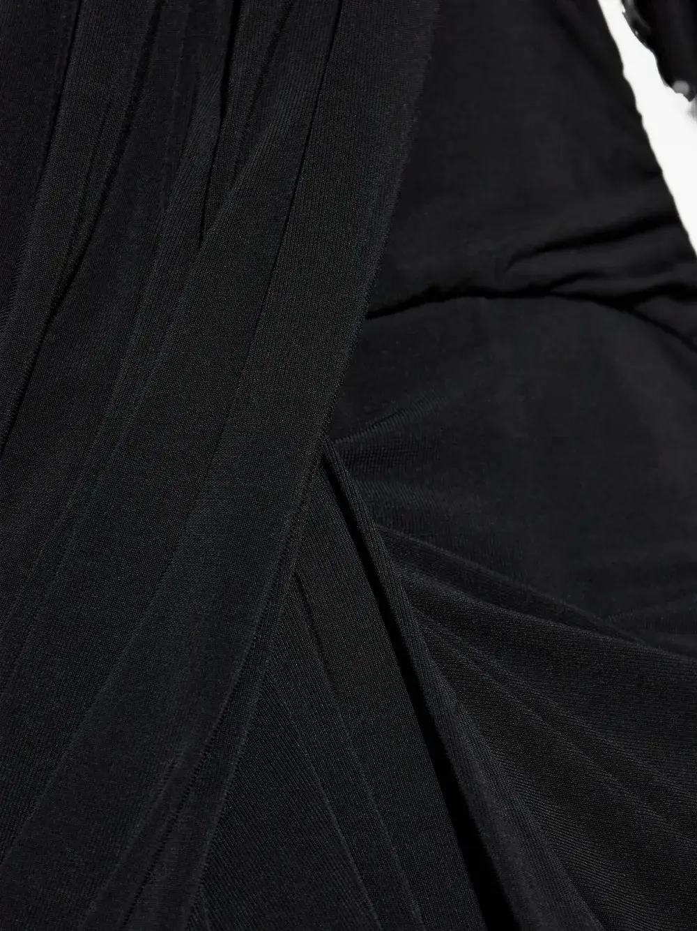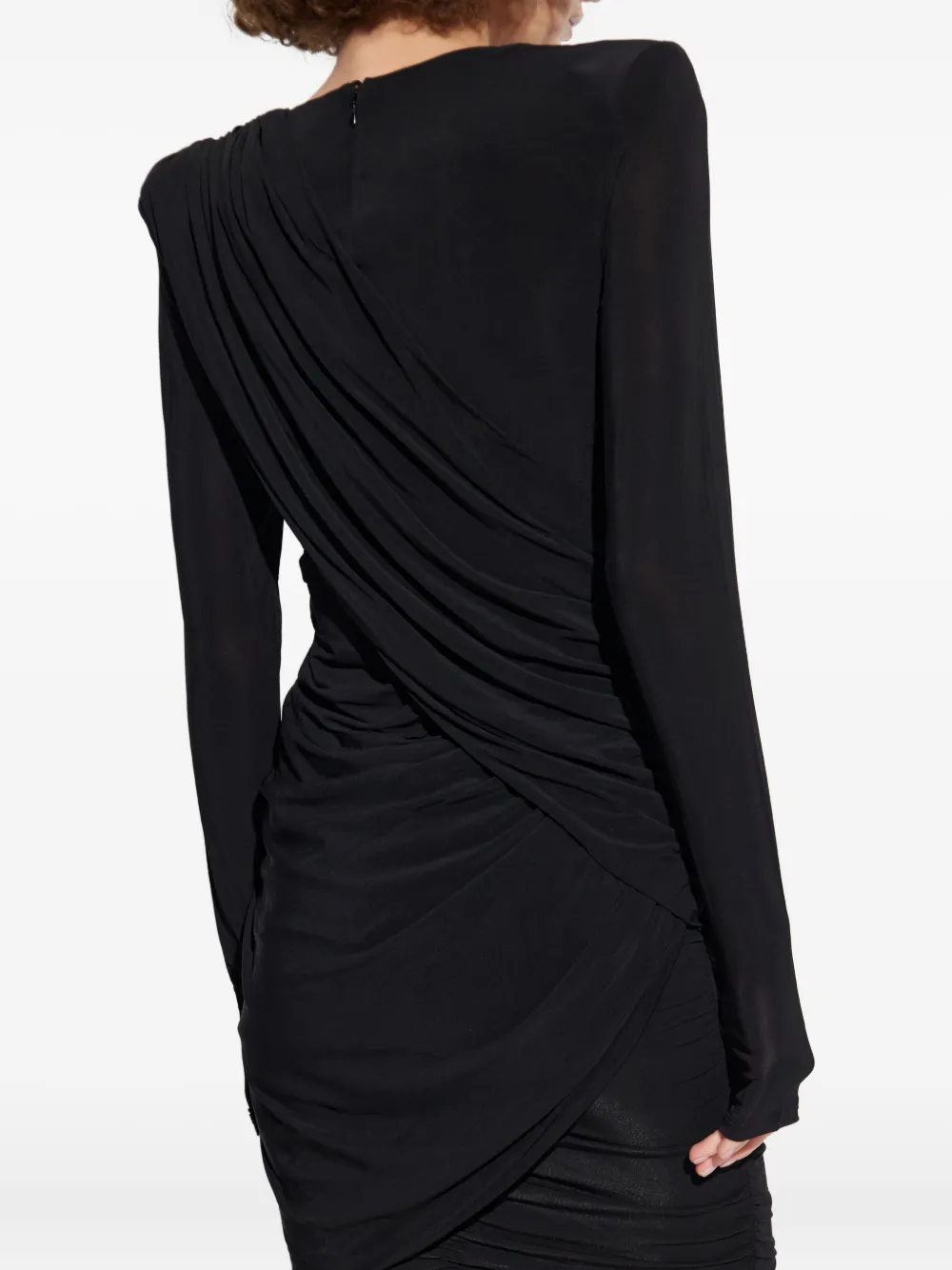 Черные драпированные детали, подплечники, длинные рукава, круглый вырез, асимметричный подол