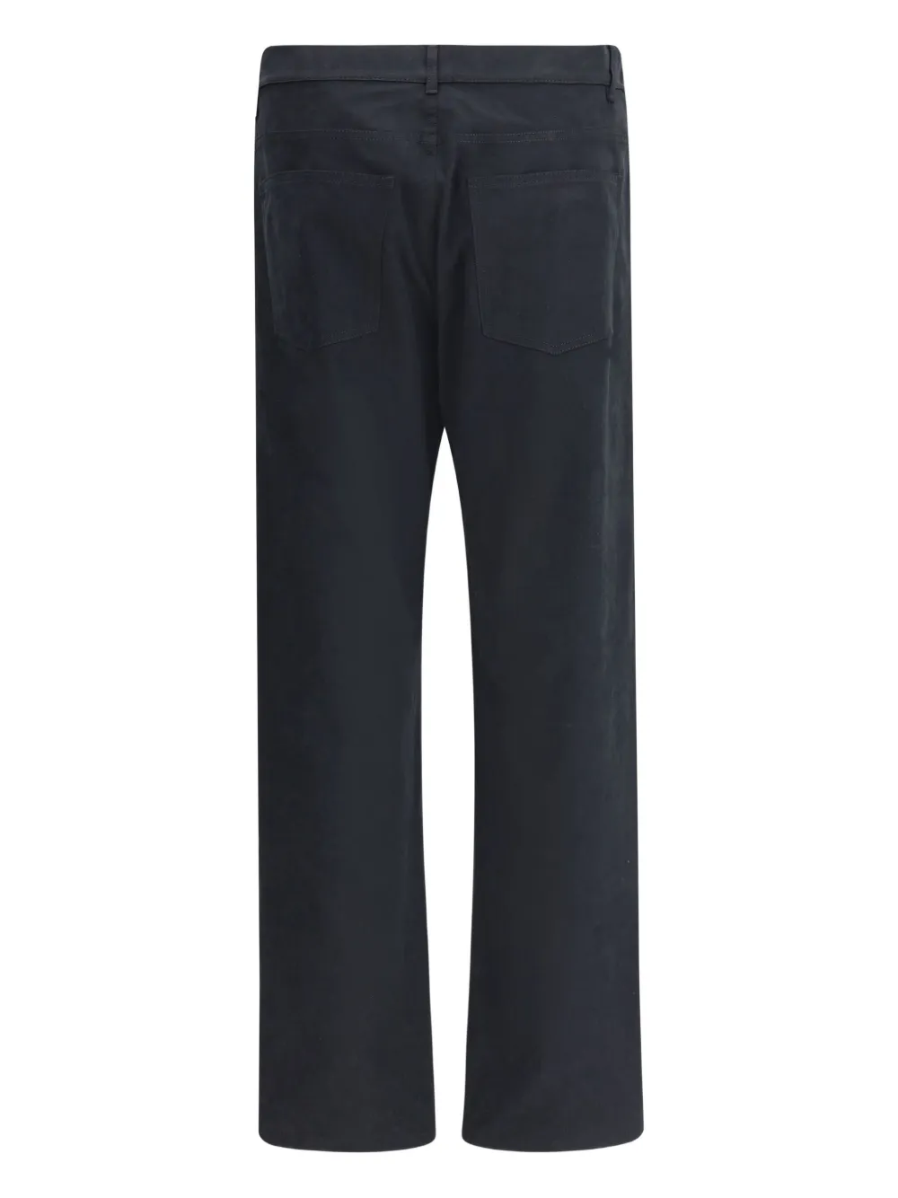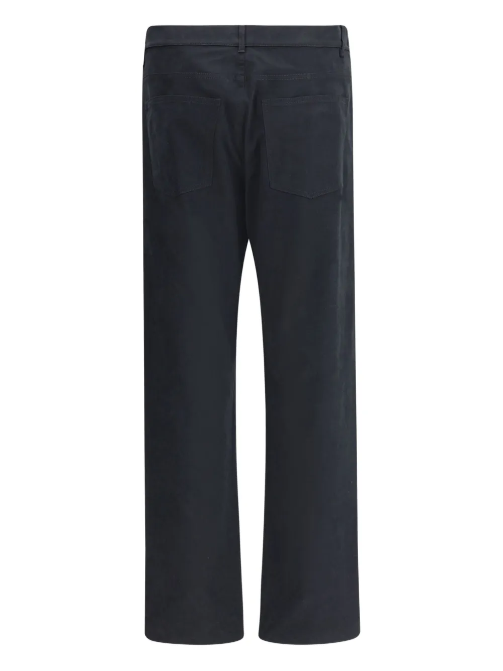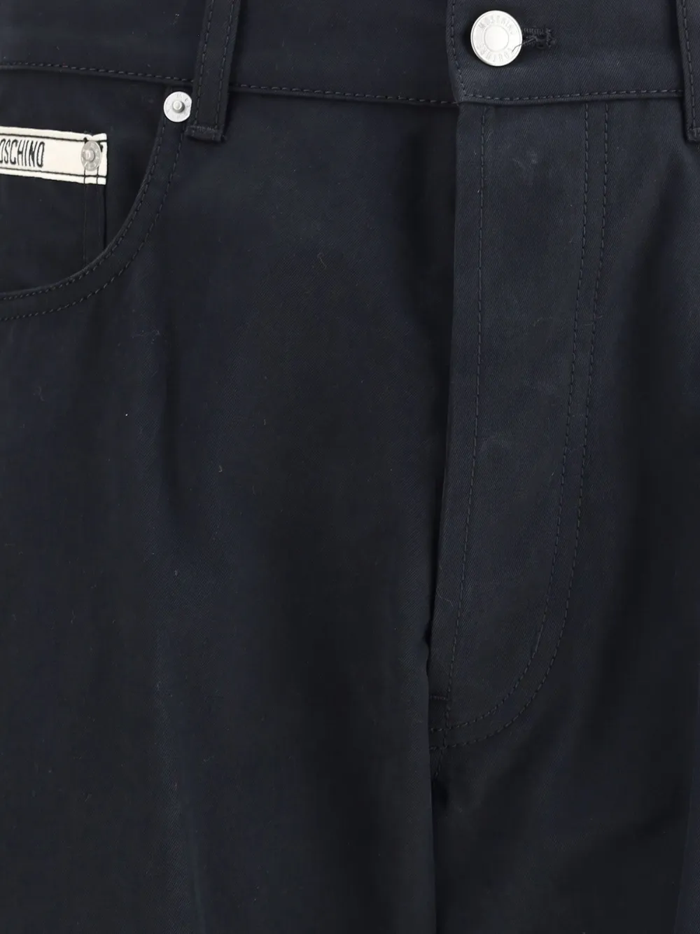 Черный с пятью карманами, застежкой на пуговицы, средней посадкой на талии, логотипом на бляшке