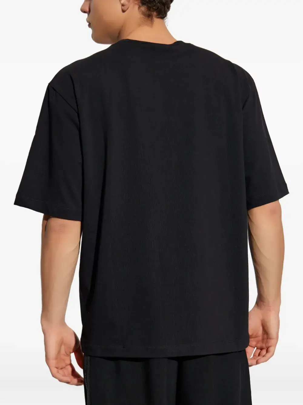 Черная вышитая деталь, накладной карман, затягивающийся на шнурок, короткие рукава, круглый вырез горловины