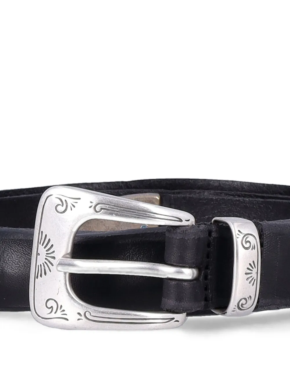 Пряжка из черной кожи серебристого тона с гравировкой, заостренный кончик, однозубцовая пряжка