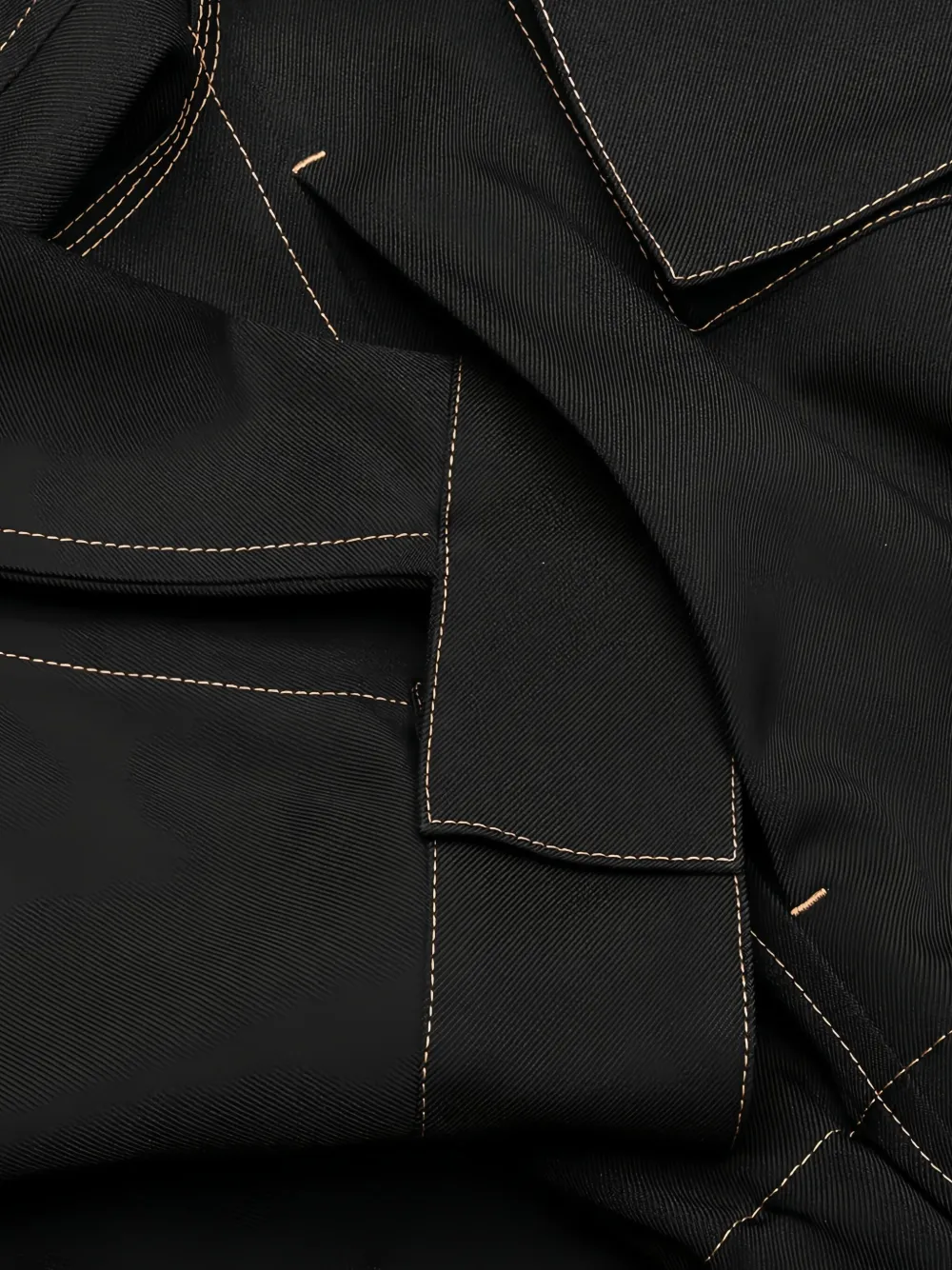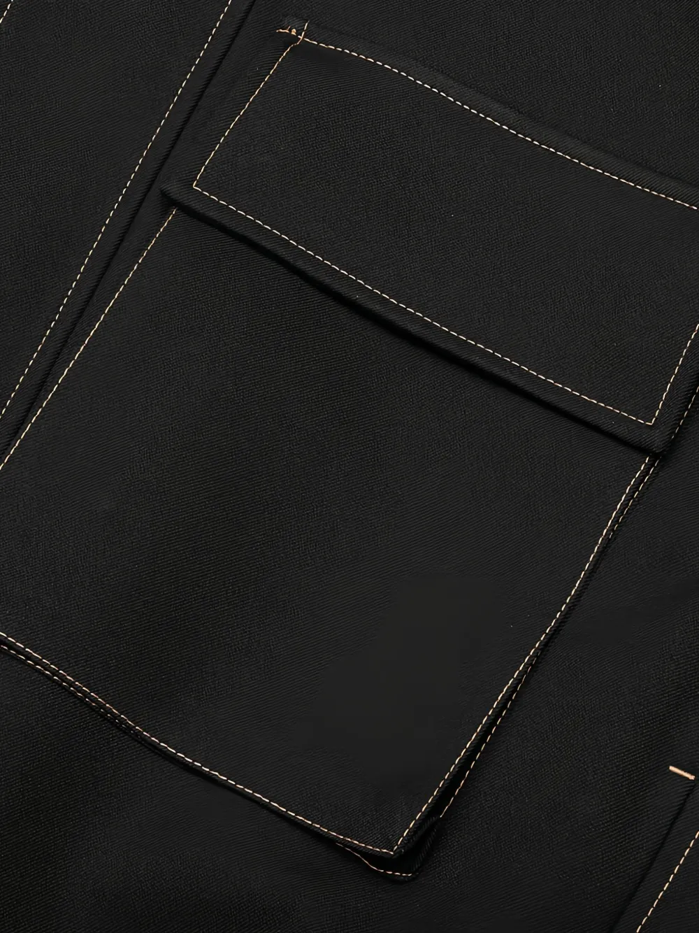 Черный эластичный подол, два кармана с клапанами, контрастная строчка, воротник-стойка, длинные рукава