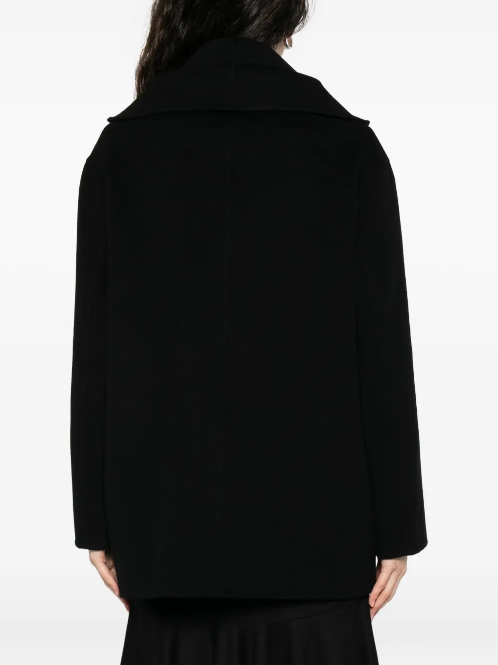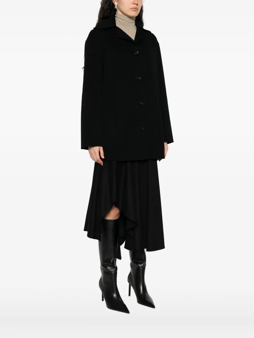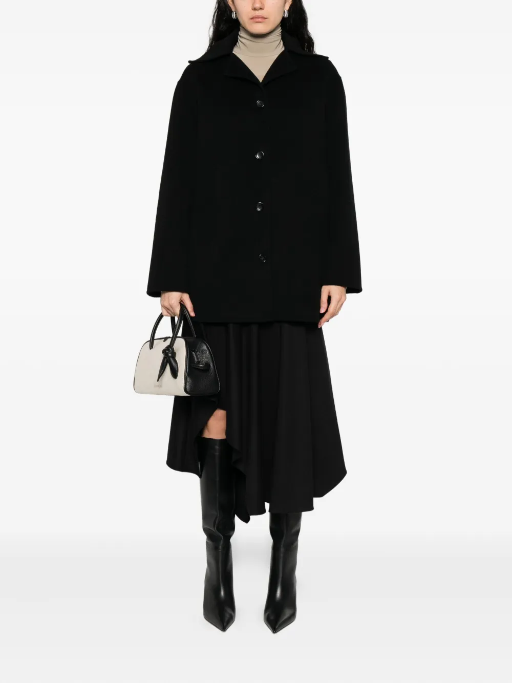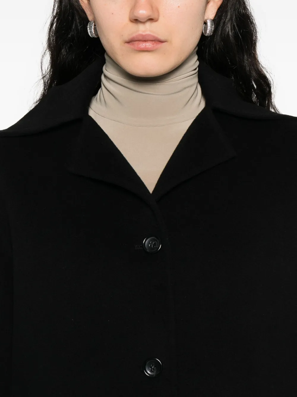 Черный воротник, застежка на пуговицы, длинные рукава, прямой подол, шерстяная ткань