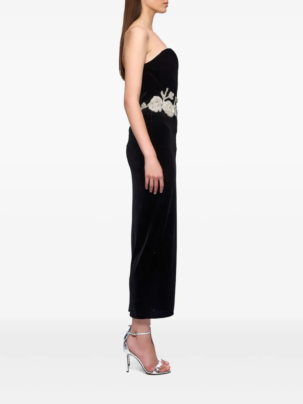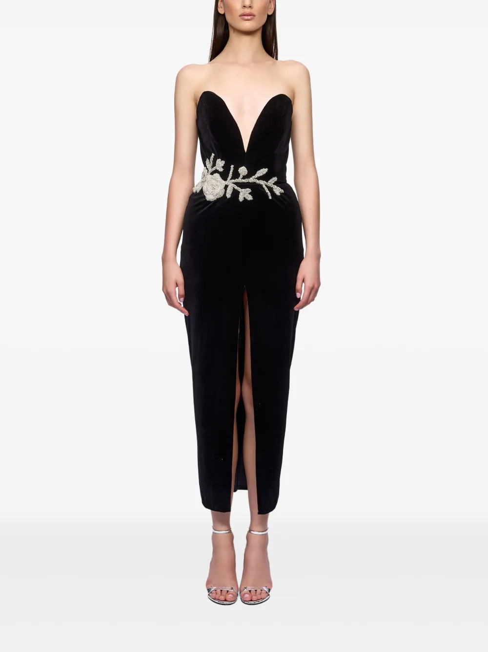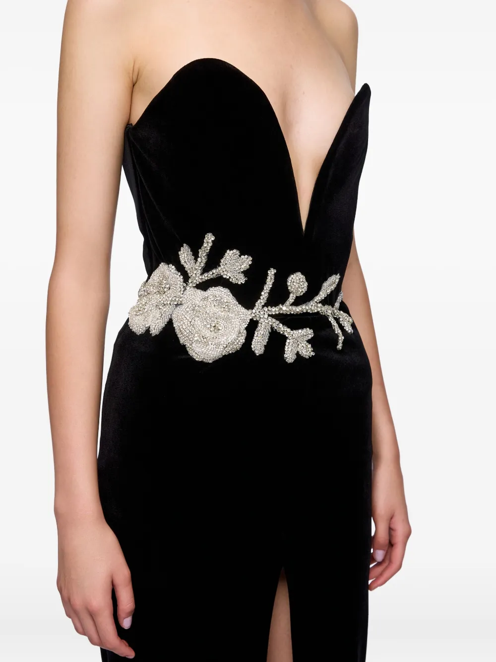 Черный бархатный материал, украшенный цветочным узором, вырез без бретелек, разрез спереди, шнуровка сзади