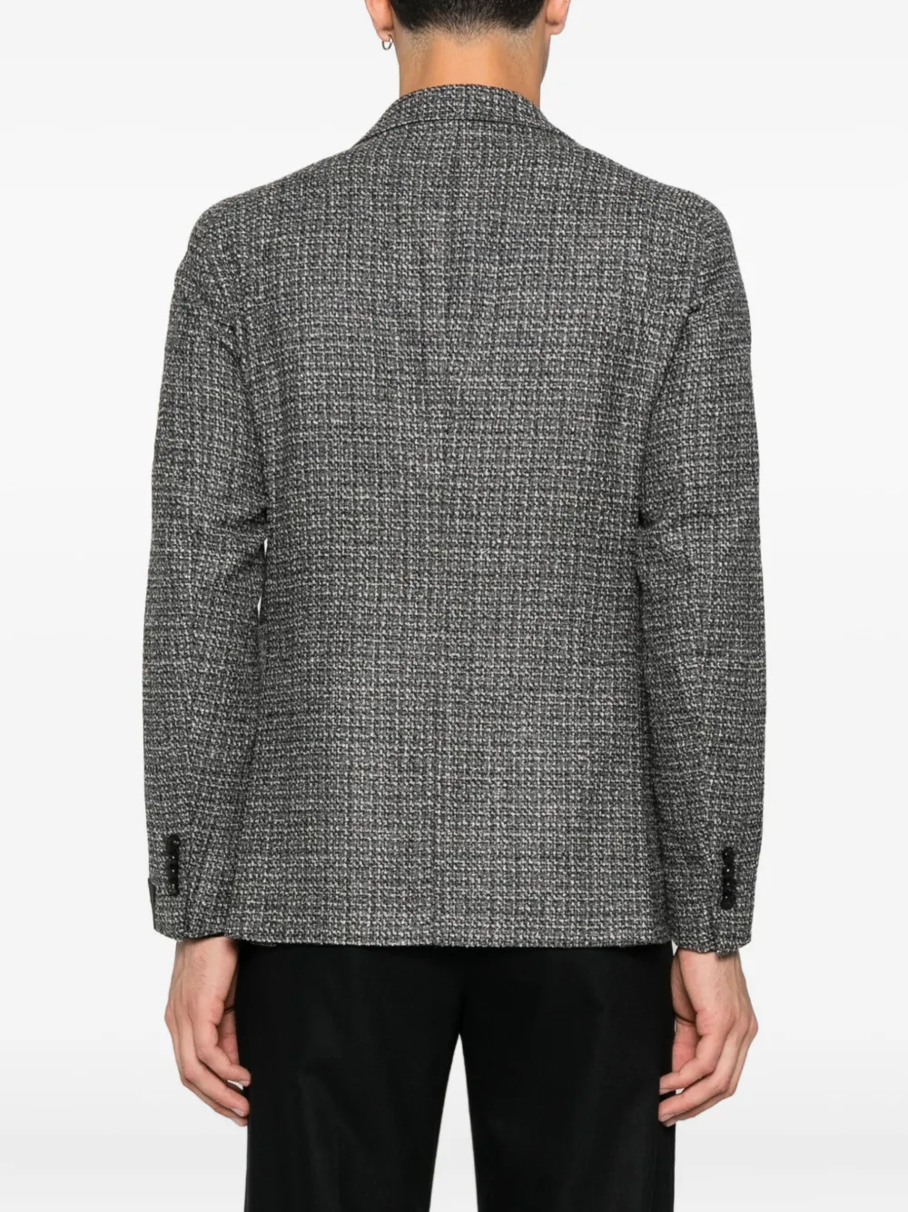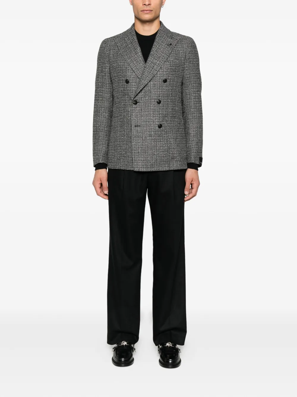 Двубортный пиджак с текстурированной черной и серой тканью, застежка на заостренные лацканы, отделка пуговицами, длинные рукава