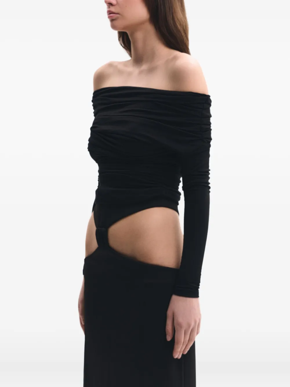 Черный вырез с открытыми плечами, драпированный лиф, длинные рукава