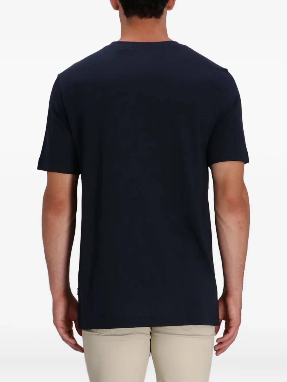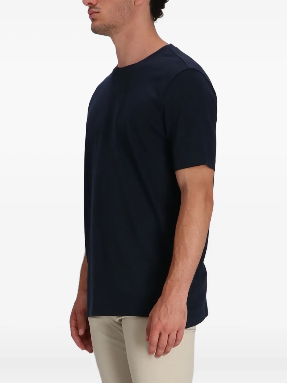 Синий круглый вырез горловины, короткие рукава, прямой подол, логотип