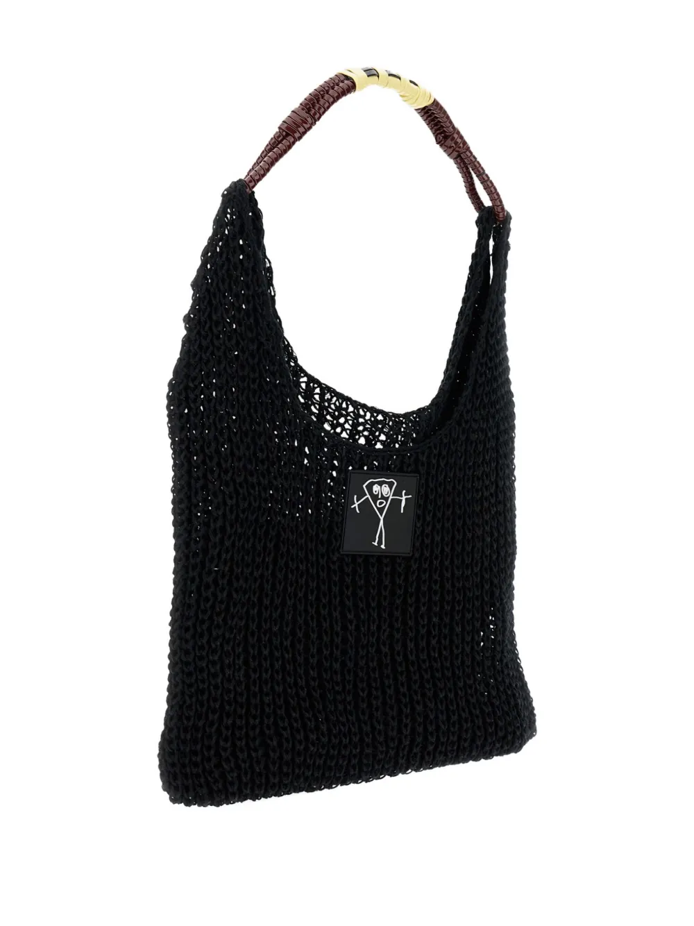 Черная сетчатая конструкция, плетеная ручка, открытый верх, нашивка с логотипом