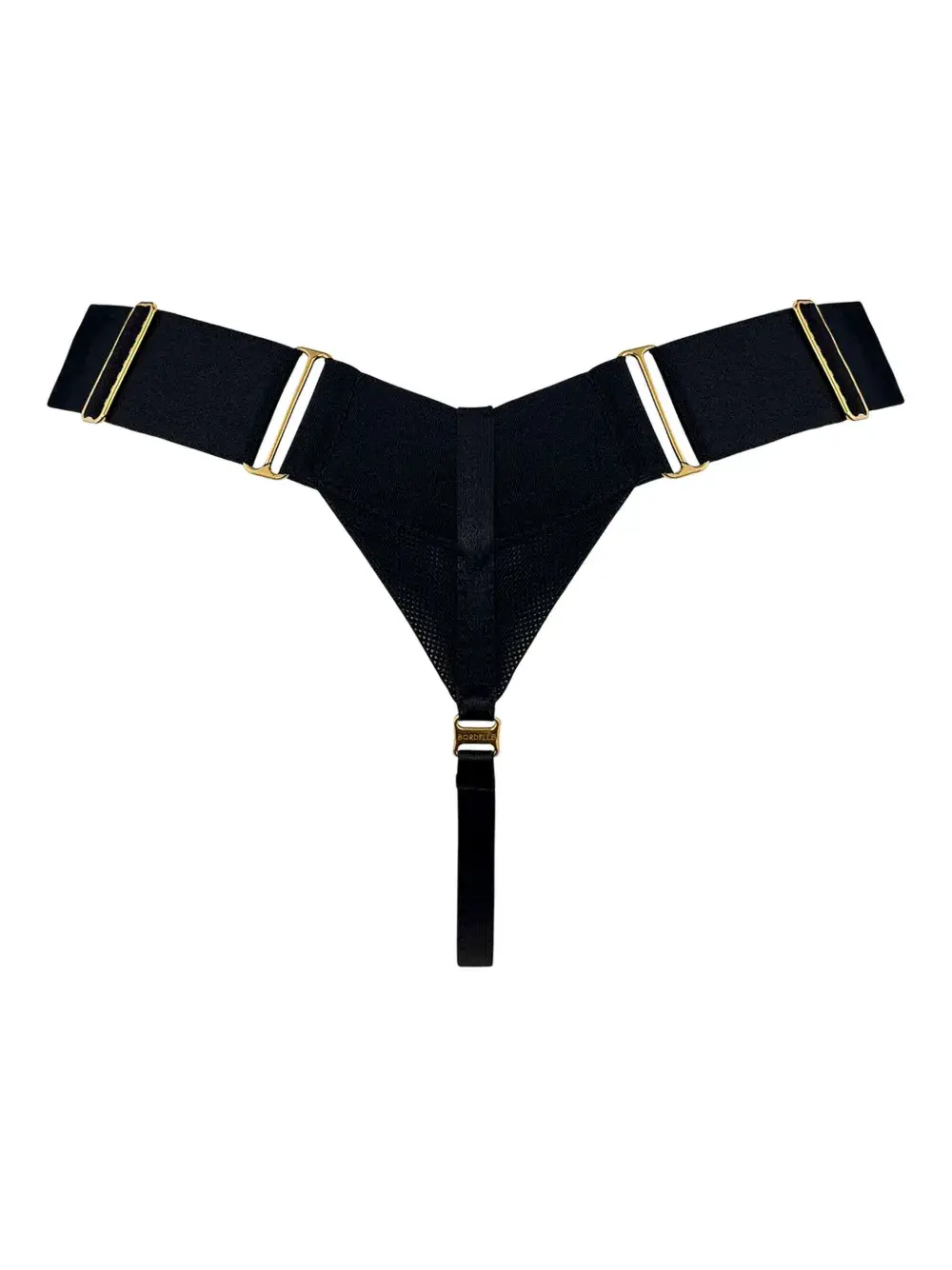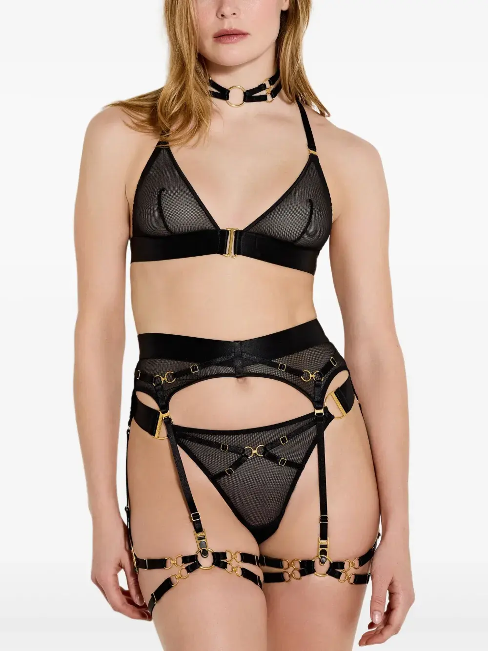Черная сетчатая ткань, фурнитура с 24-каратным золотым покрытием, перекрещенные лямки. Напоминаем, что это изделие следует примерять поверх собственной одежды.