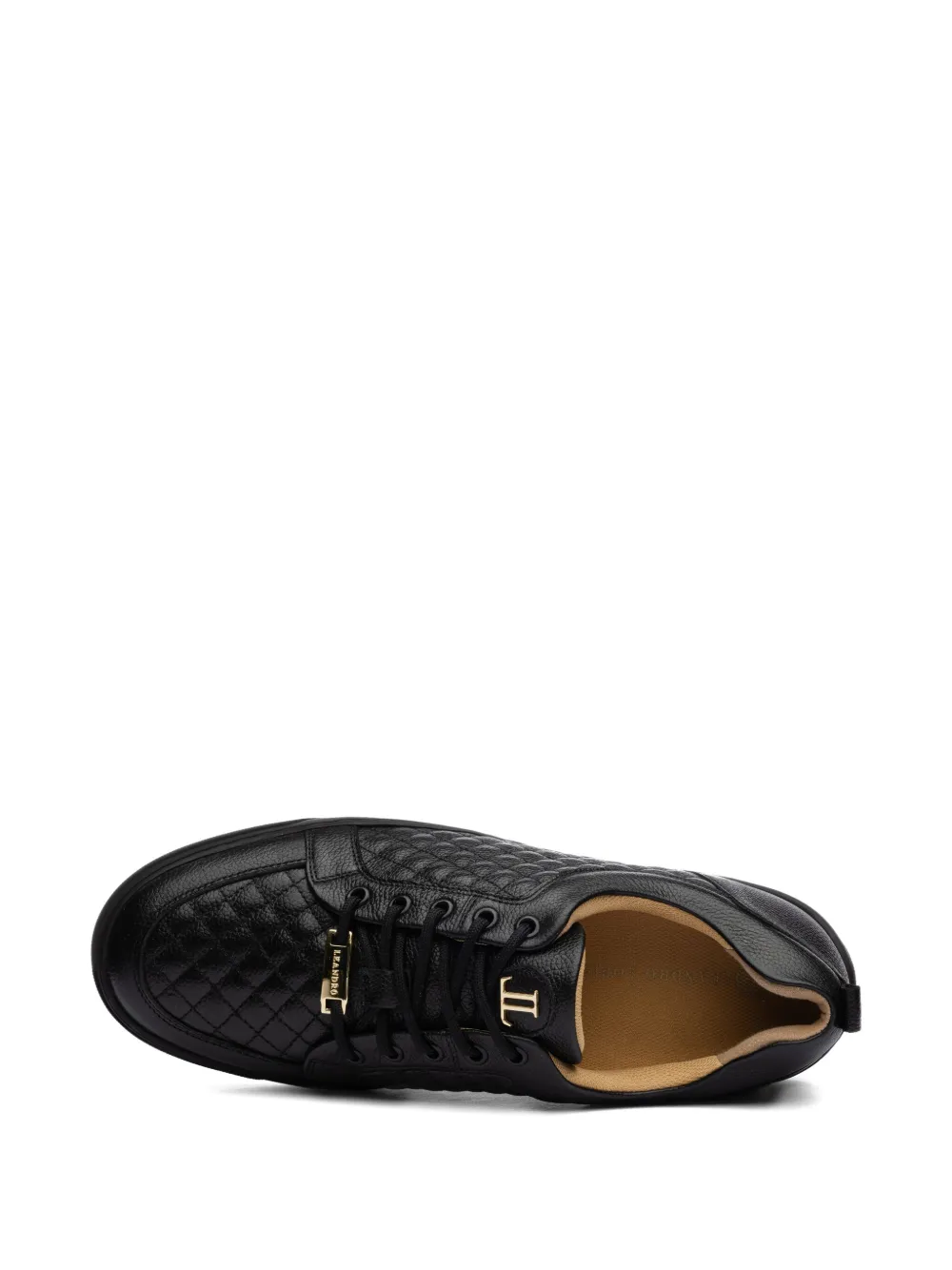 Черная стеганая кожа, шнуровка, золотистый логотип, резиновая подошва, низкий верх