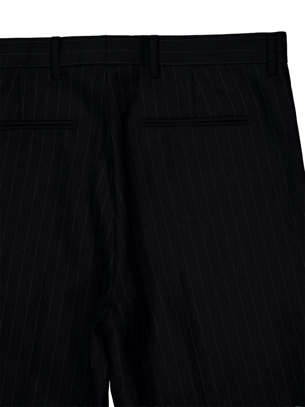 Черная английская шерсть в тонкую полоску, прямой крой, плоский перед, потайная застежка