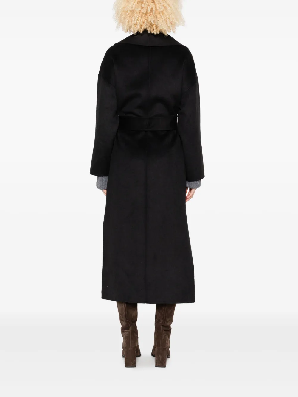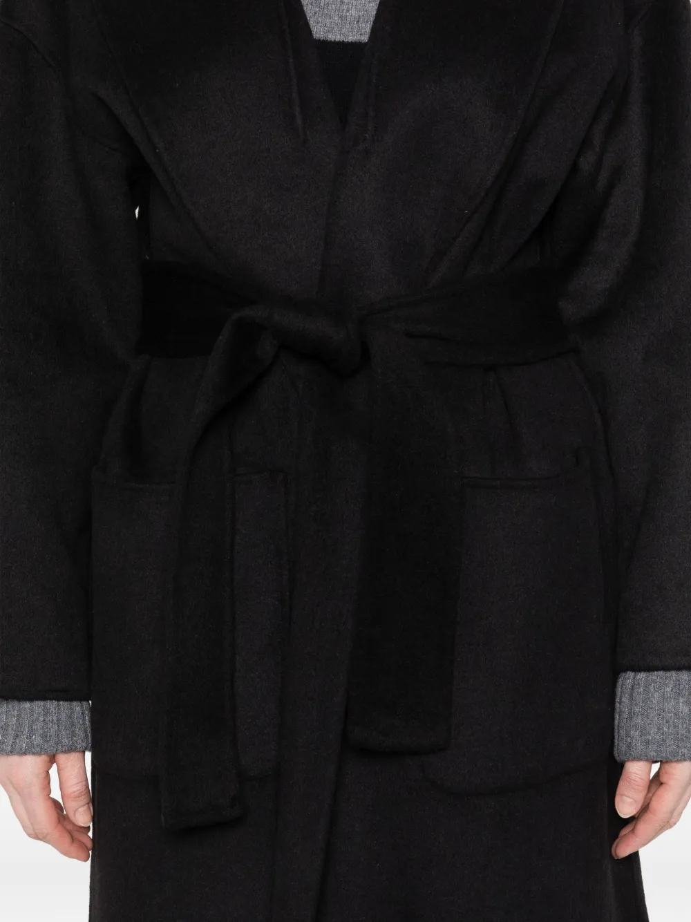 Черный пояс с завязкой, накладные карманы, длинные рукава, запах спереди