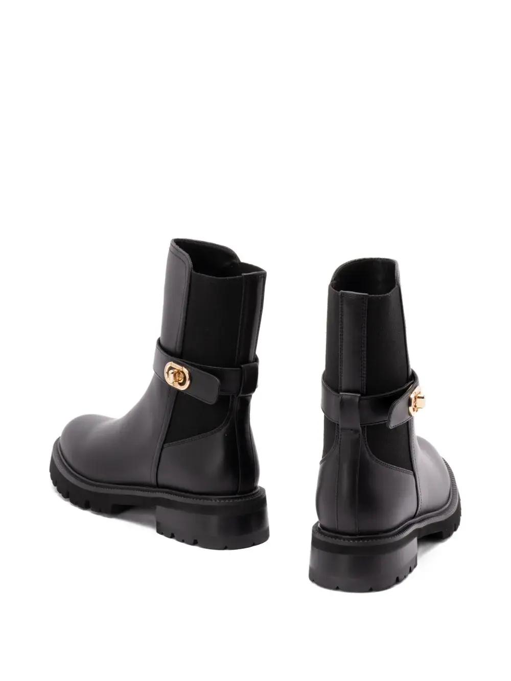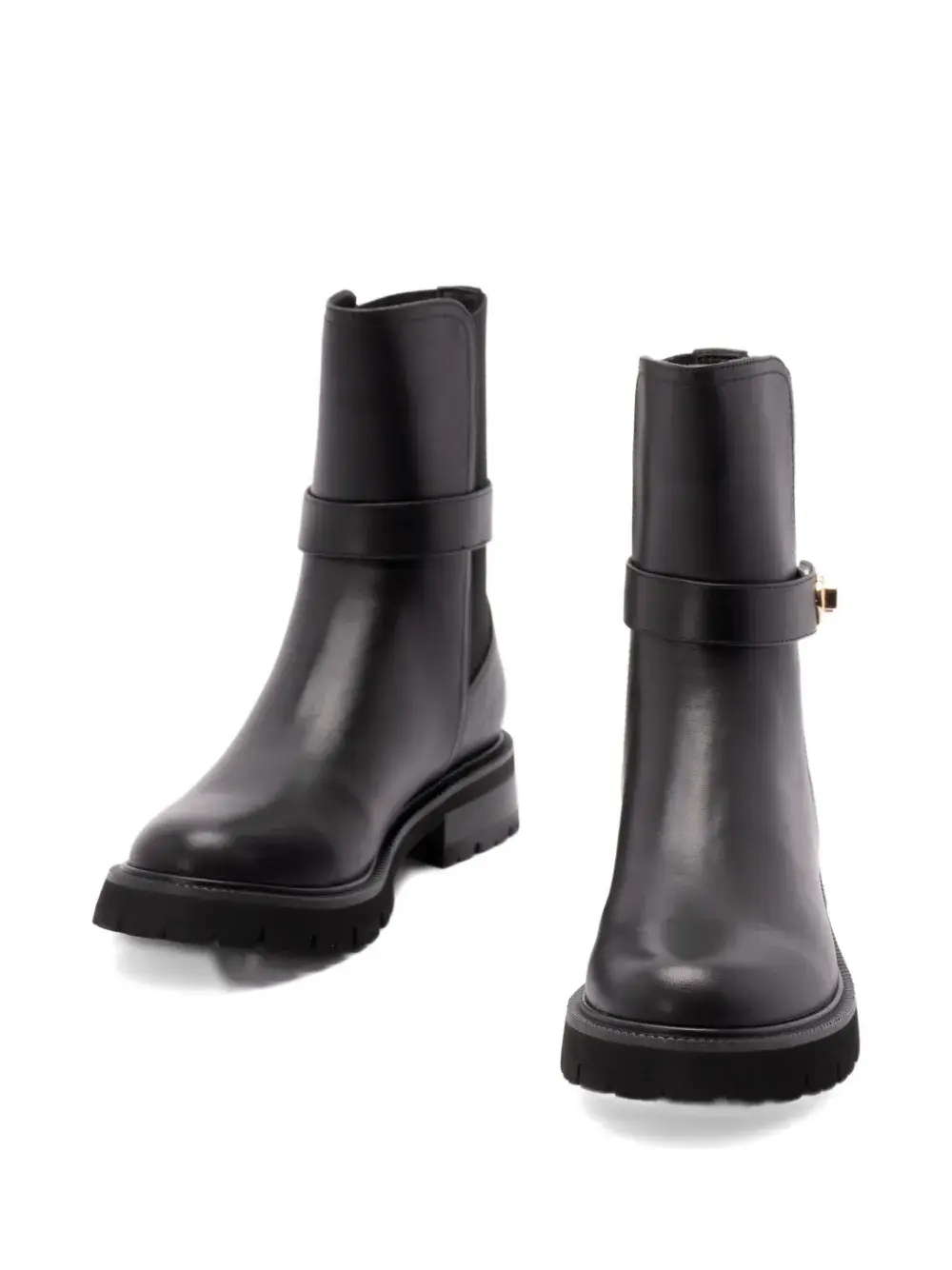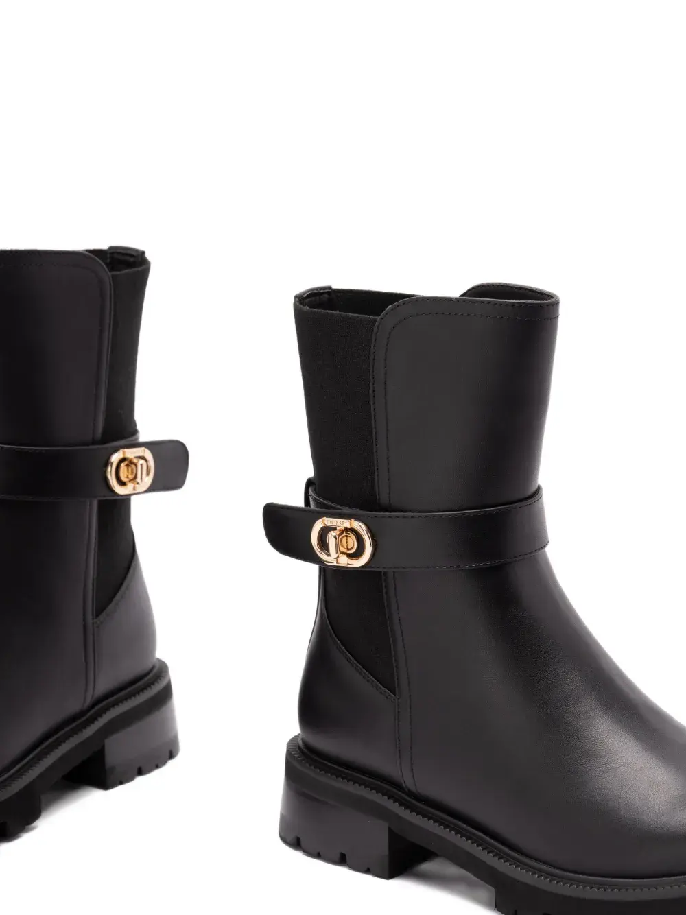 Верх из черной кожи, застежка на золотистой пряжке, эластичные боковые панели, плоская подошва, квадратный каблук
