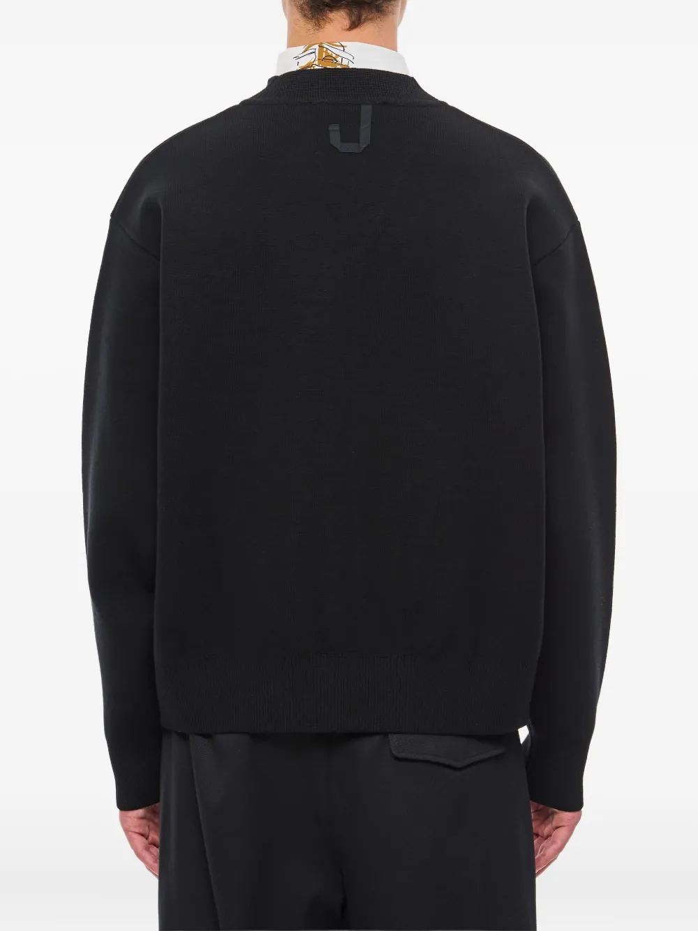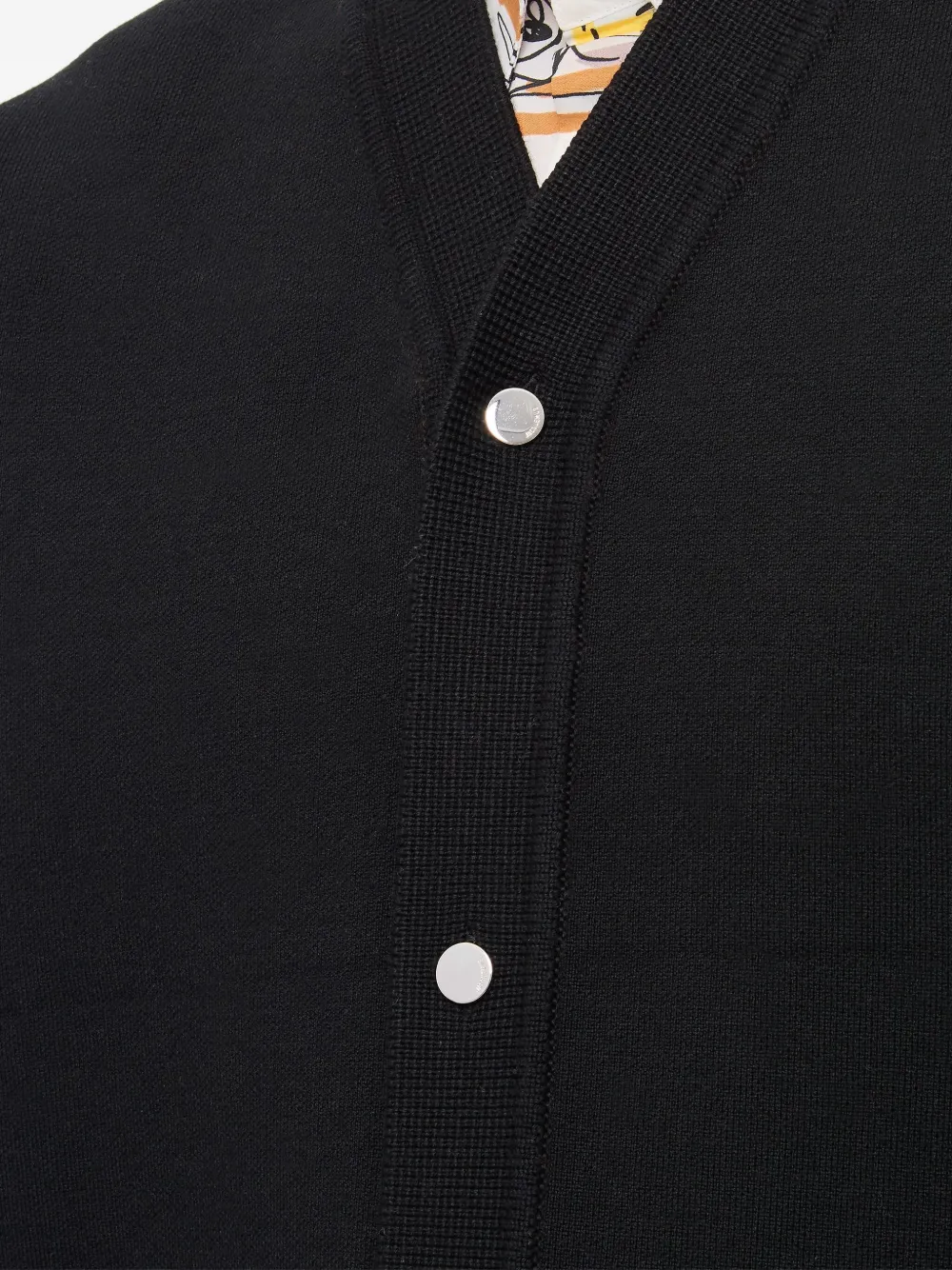 Черный V-образный вырез, застежка на пуговицы спереди, ребристые манжеты, ребристый подол, смесь мериноса