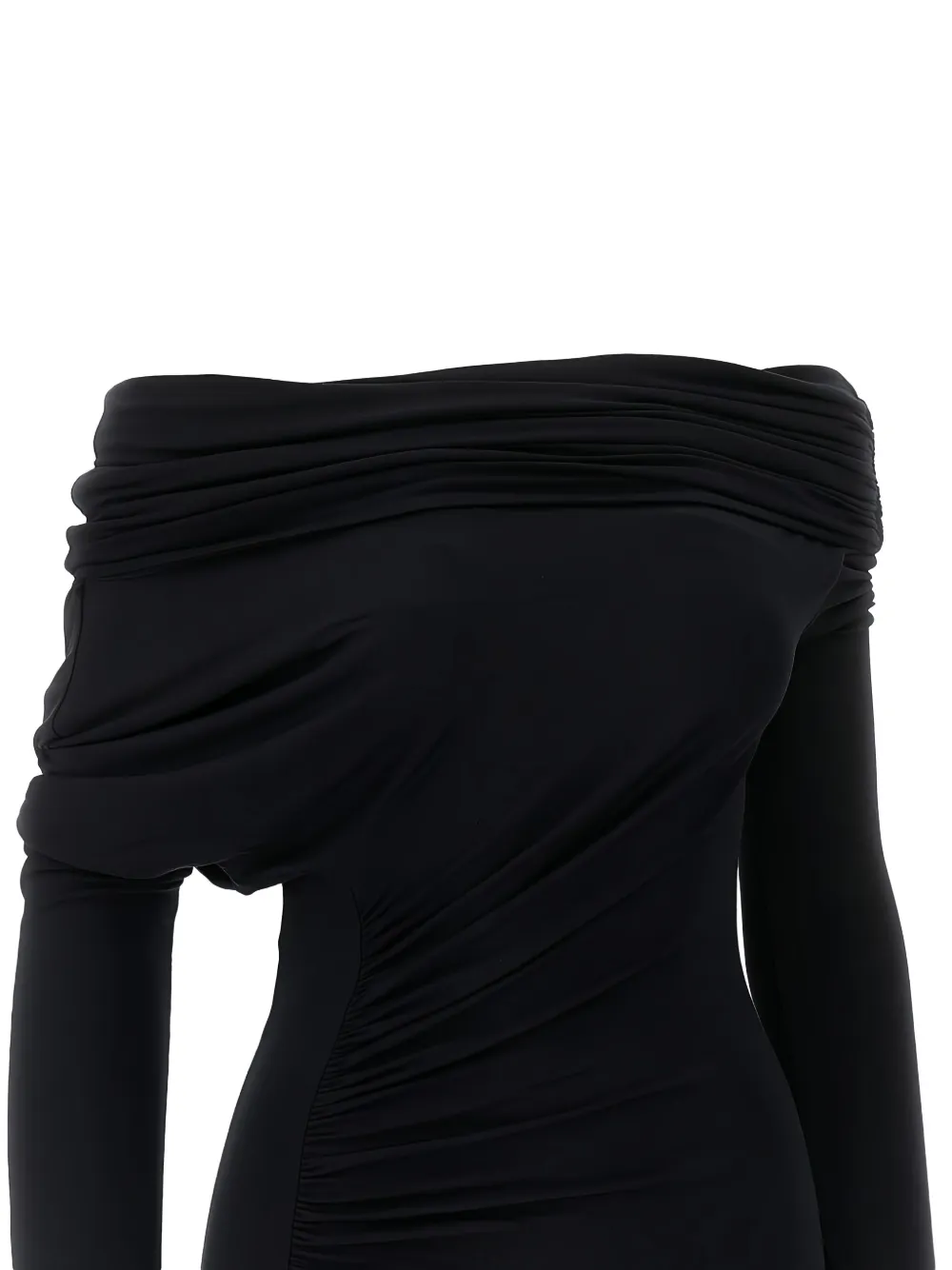 Черный драпированный вырез, открытые плечи, длинные рукава