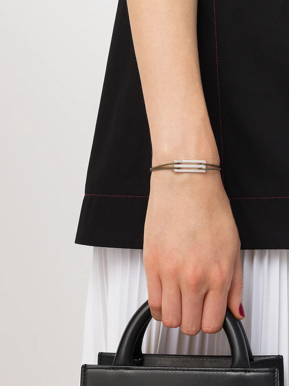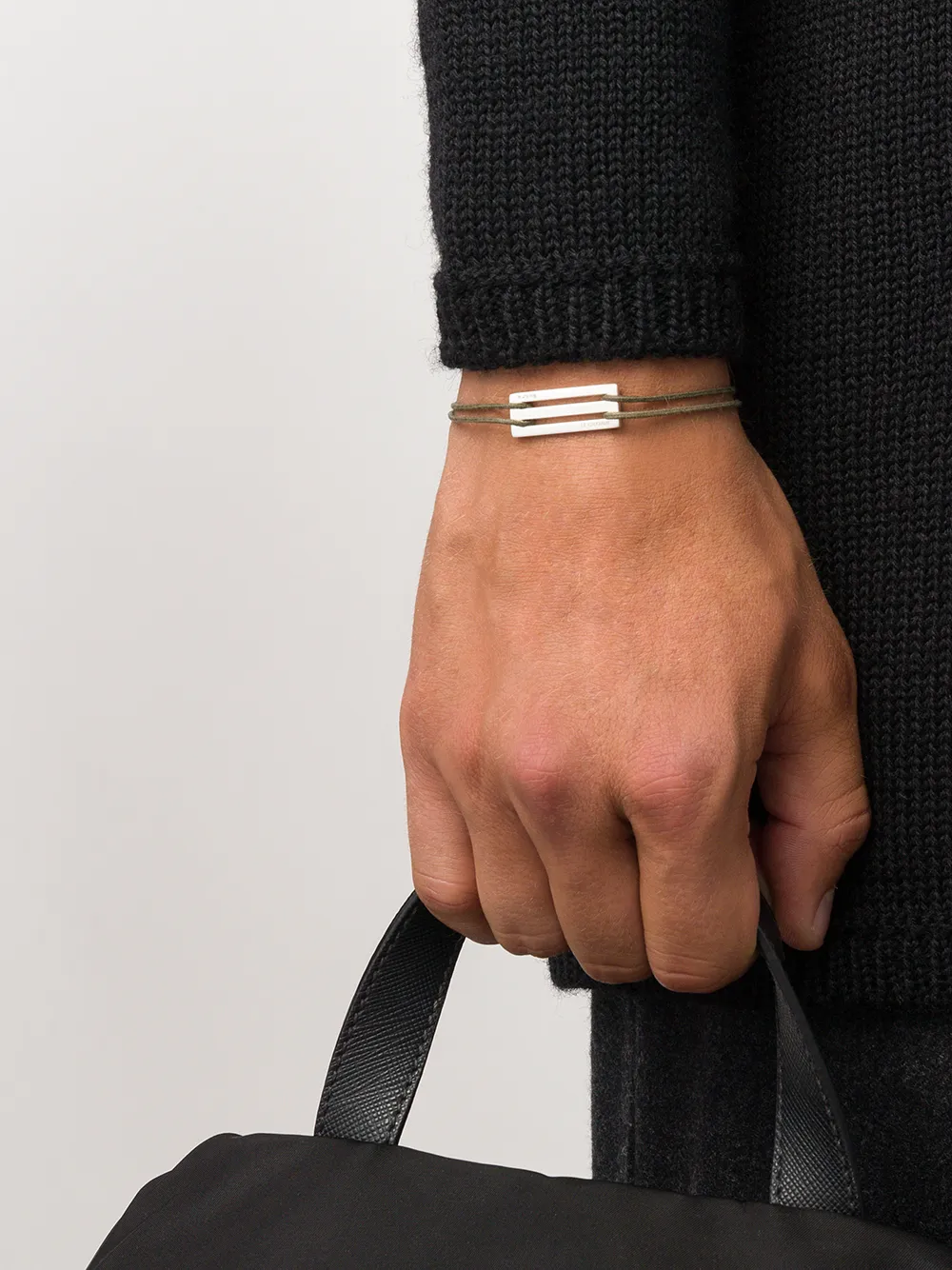 Веревочный браслет 25/10g с серебряной подвеской от Le Gramme. Гравировка логотипа и модель слип-он, без застежки. Цвет: Khaki green . Модель в стиле унисекс. Мужская система размеров