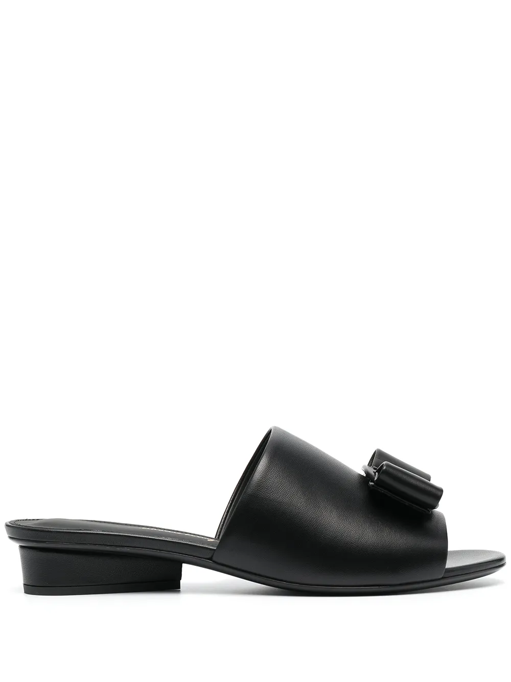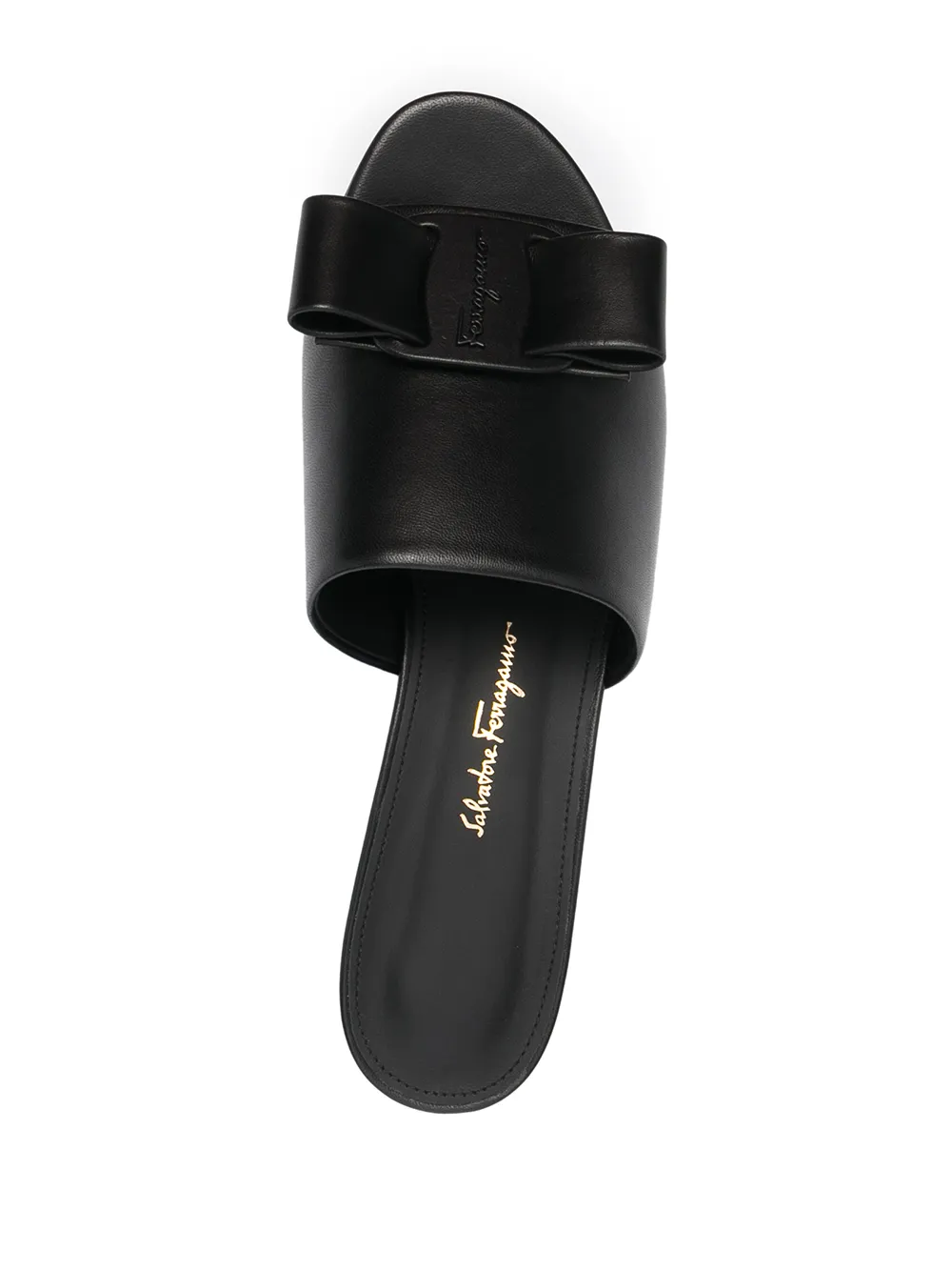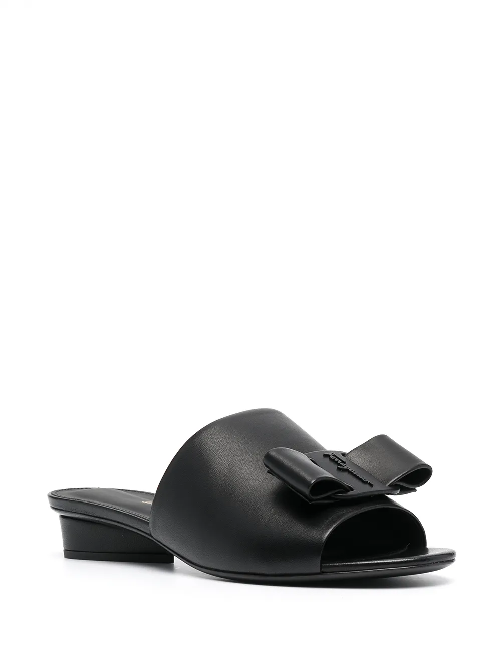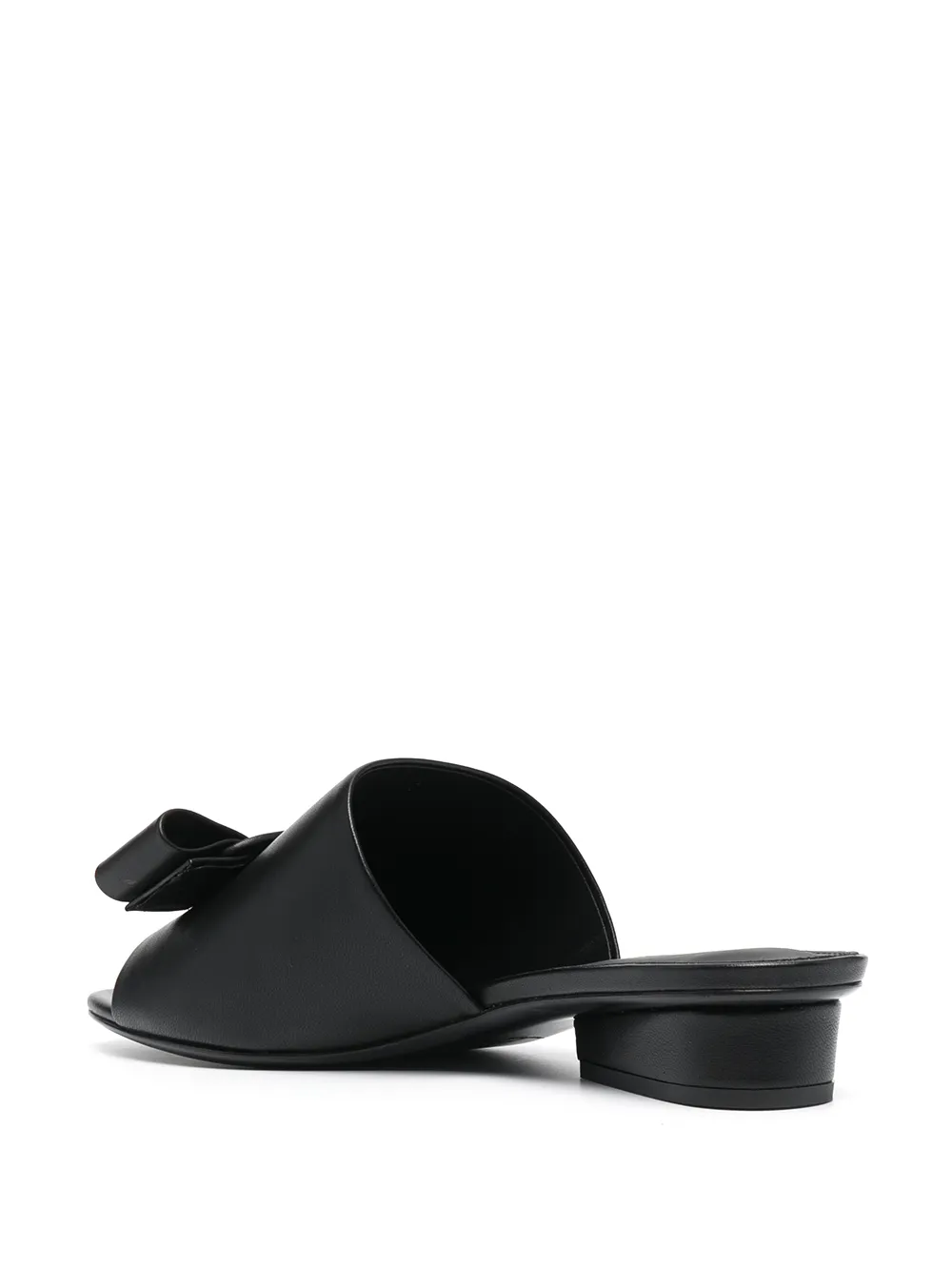Бант, выгравированный логотип, открытый носок, стелька с логотипом и низкий каблук. Цвет: черный.