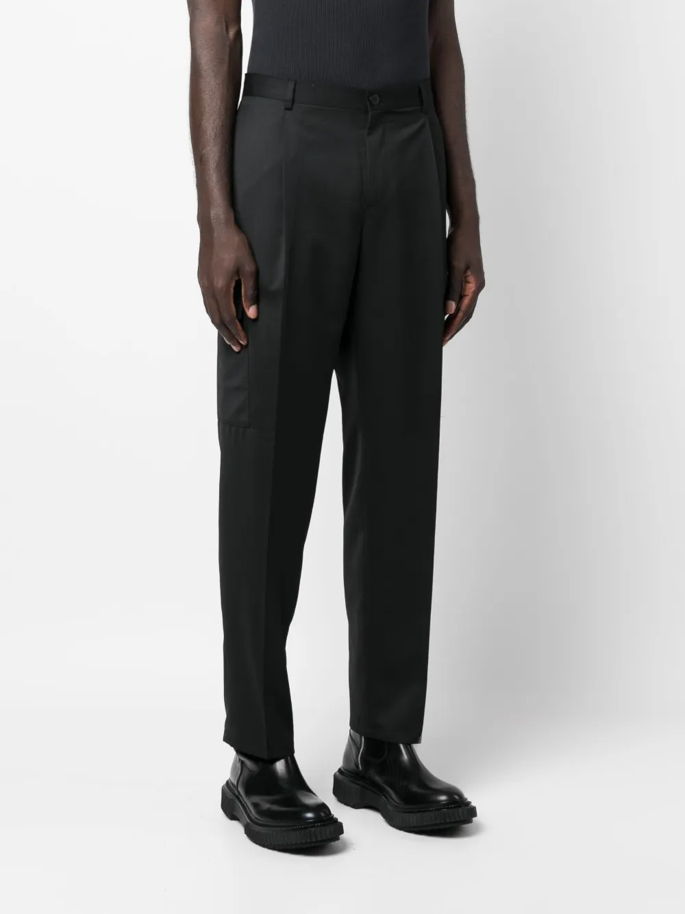 Черный, лакированное покрытие, петли для ремня, прямой крой, потайная застежка на молнии и пуговицах, два прорезных кармана по бокам, два накладных кармана по бокам и два прорезных кармана сзади.