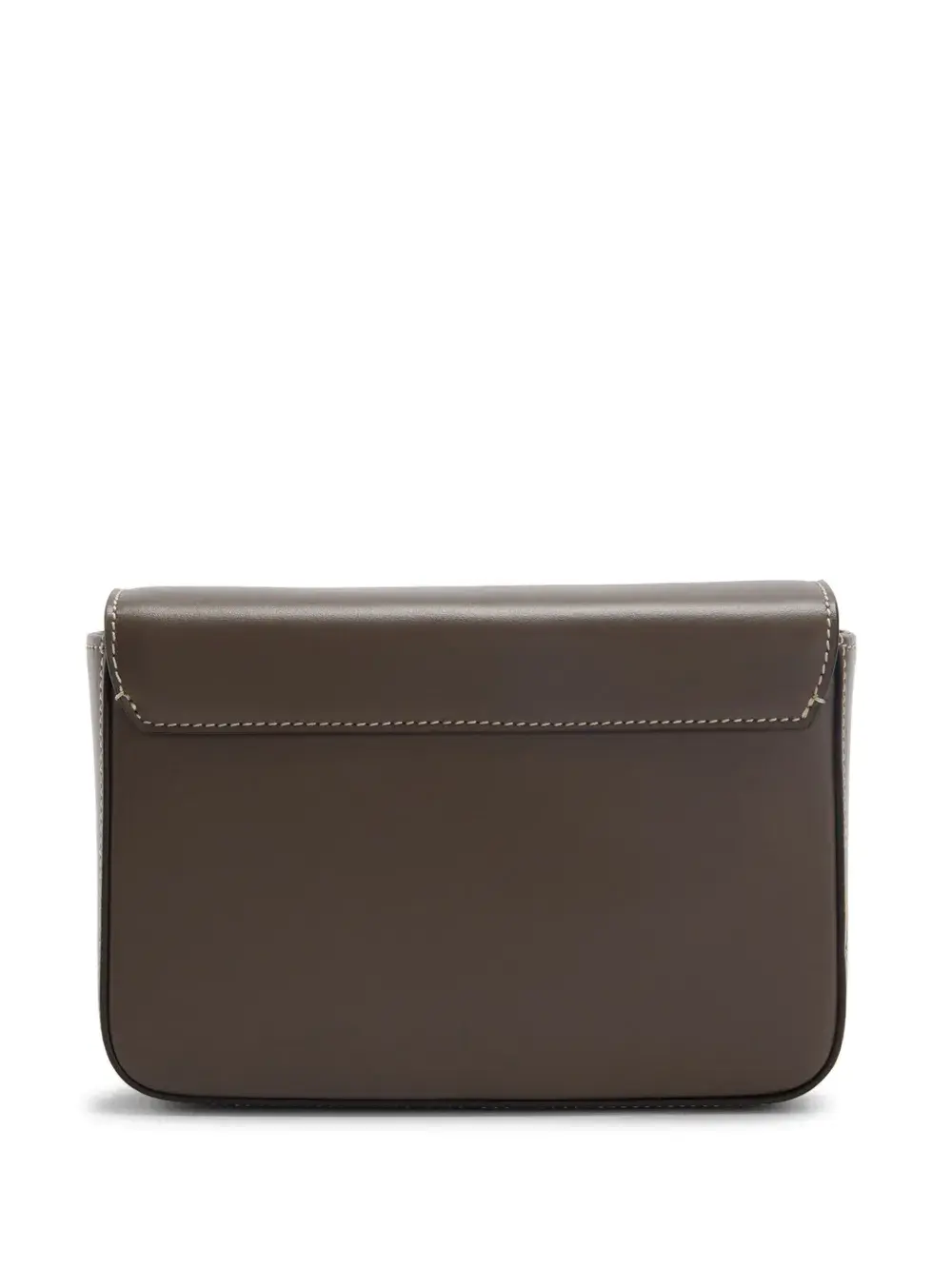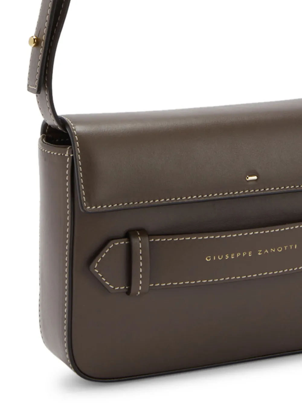 Коричневый откидной верх с магнитной застежкой, контрастная строчка, основное отделение, съемный плечевой ремень, золотистые буквы логотипа