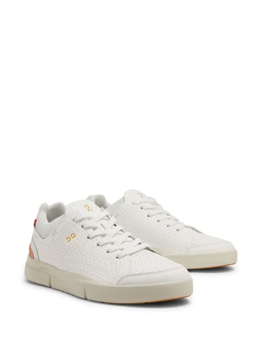 Молочно-белый, кораллово-розовый, искусственная кожа, перфорированная модель, логотип сбоку, язычок с логотипом, нашивка с логотипом сбоку, логотип, вставки из сетчатой ткани, закругленный носок, шнуровка спереди, стелька с логотипом и массивная резиновая подошва.