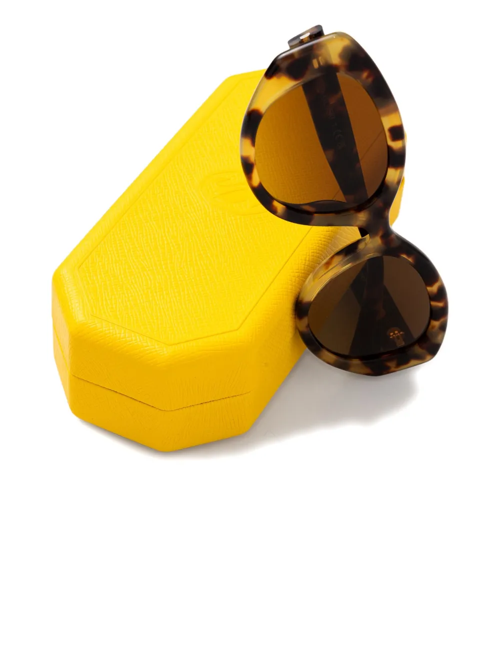 Коричневая оправа «кошачий глаз», прямые дужки, изогнутые кончики. Очки поставляются с защитным футляром.