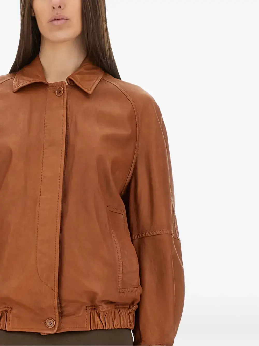 Коричневая кожаная конструкция, эластичный подол, застежка на пуговицы, рукава реглан, прорезные карманы