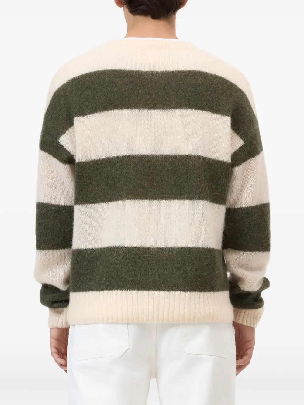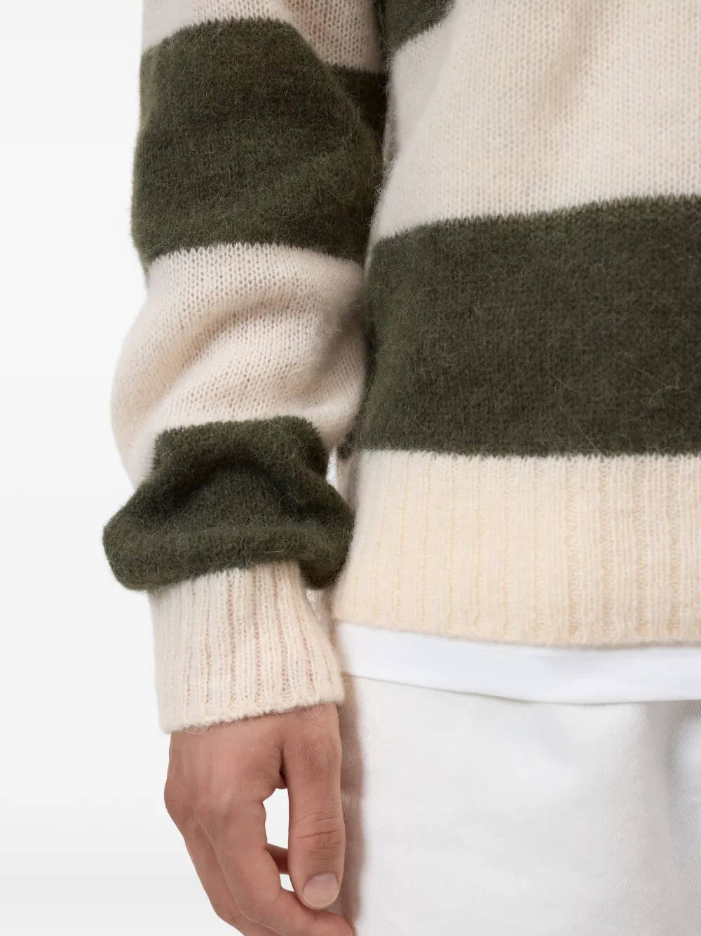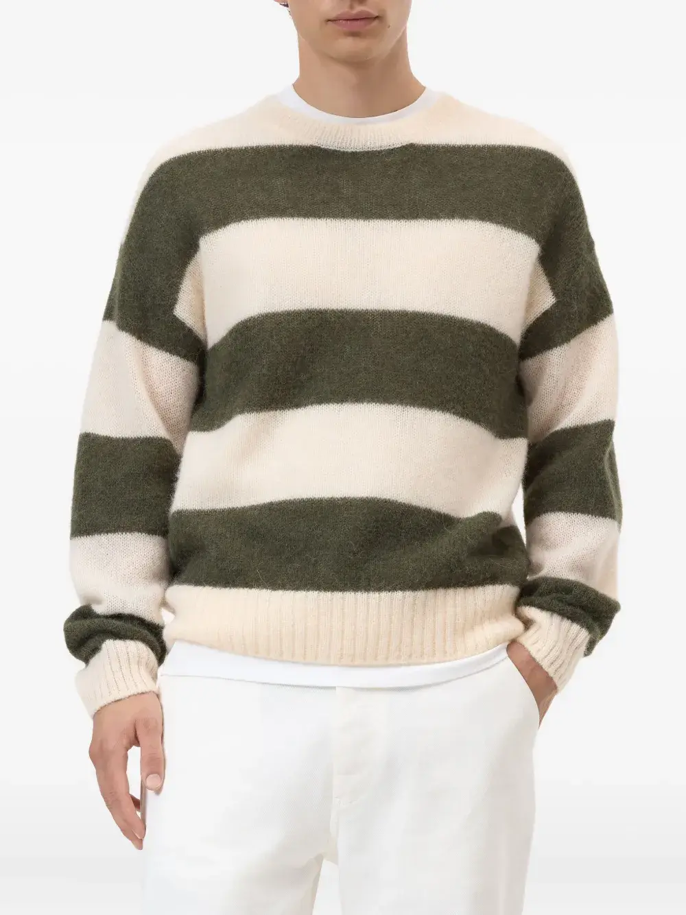 Горизонтальные полосы белого и оливково-зеленого цветов, круглый вырез горловины, длинные рукава, ребристые манжеты и подол