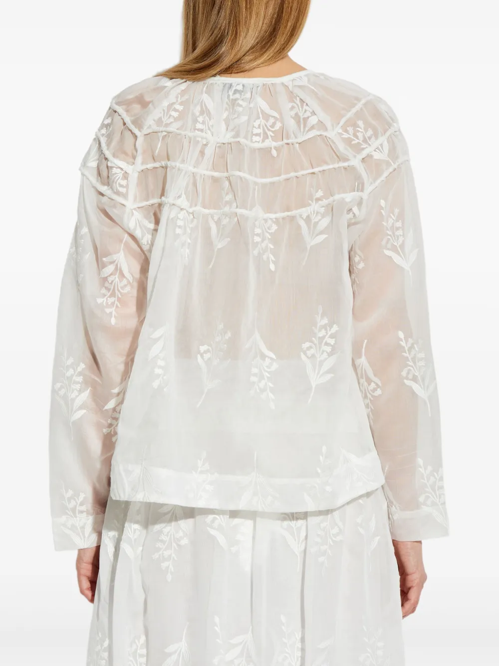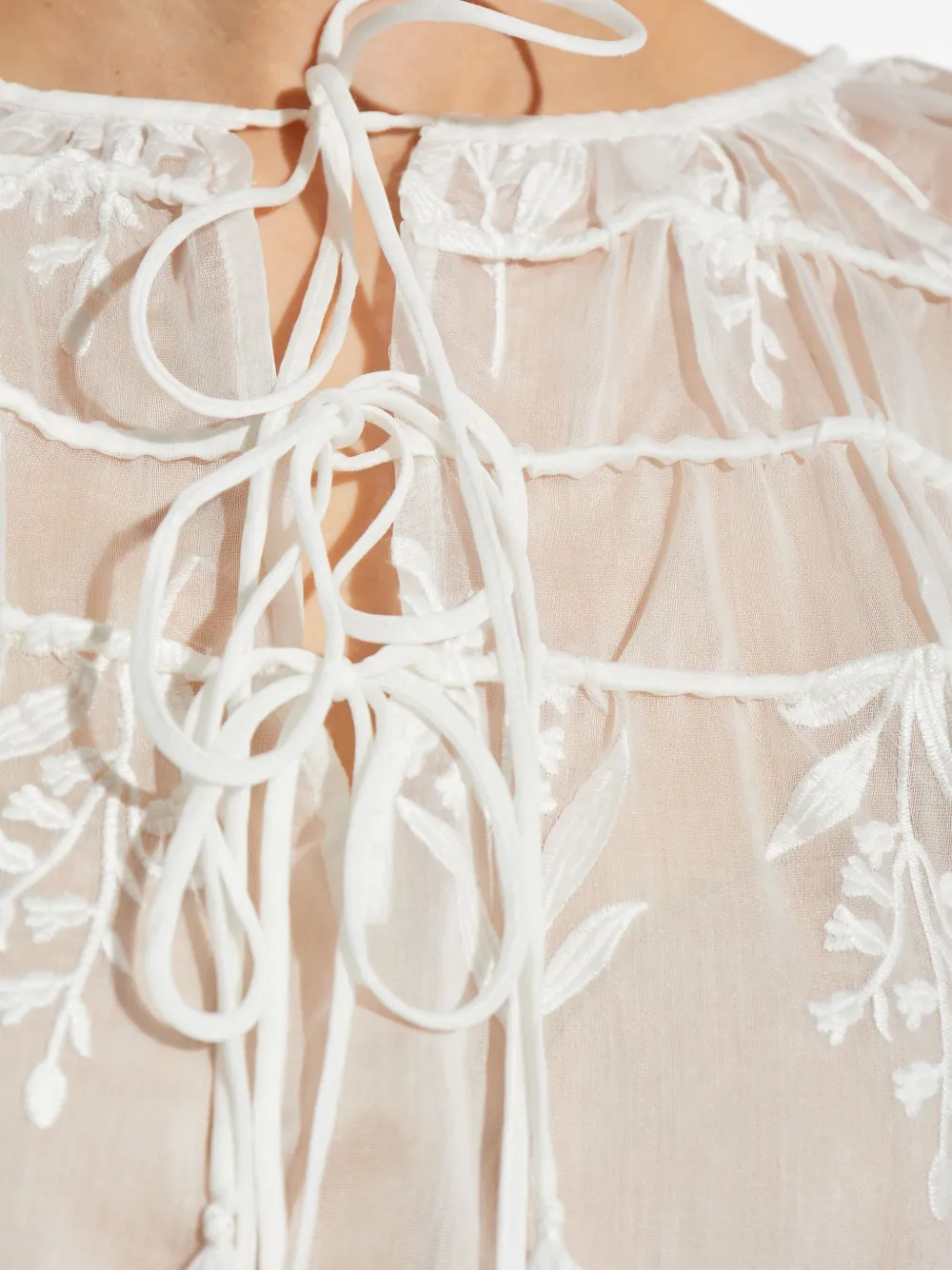 Белая цветочная вышивка, собранные детали, шнуровка, длинные рукава