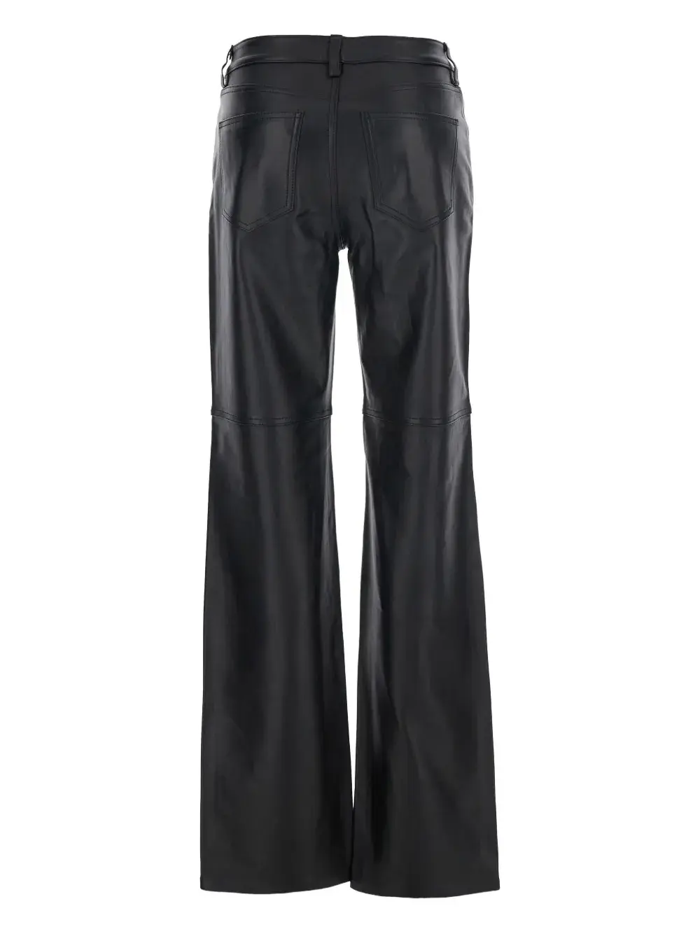 Расклешенные брюки из черной кожи, пять карманов, застежка на пуговицы, шлевки для ремня