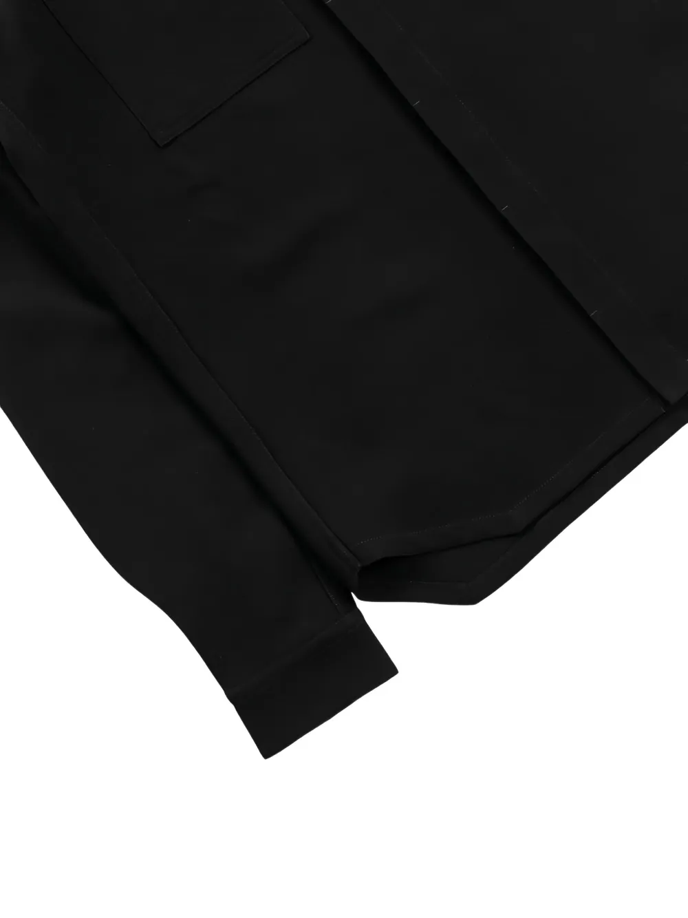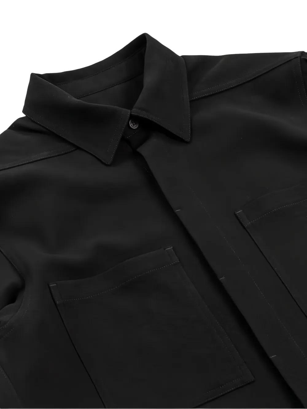 Черные длинные рукава, застежка на пуговицы, два нагрудных кармана, заостренный воротник
