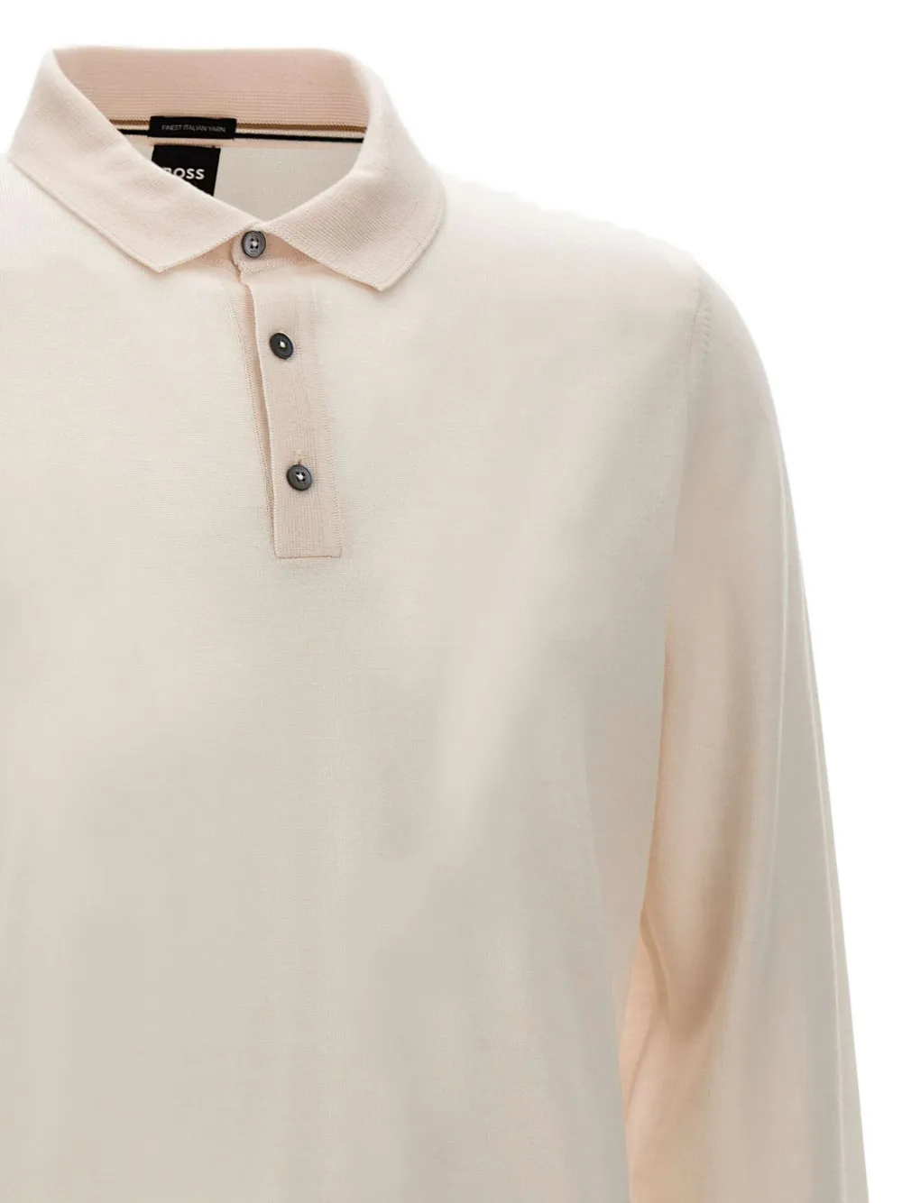 Мужская рубашка-поло Boss «Lancione» из тонкой итальянской натуральной шерсти для максимальной мягкости, кремового и черного цветов, длинные рукава, классический воротник на трех пуговицах, ребристые манжеты, классический крой. 100% шерсть;