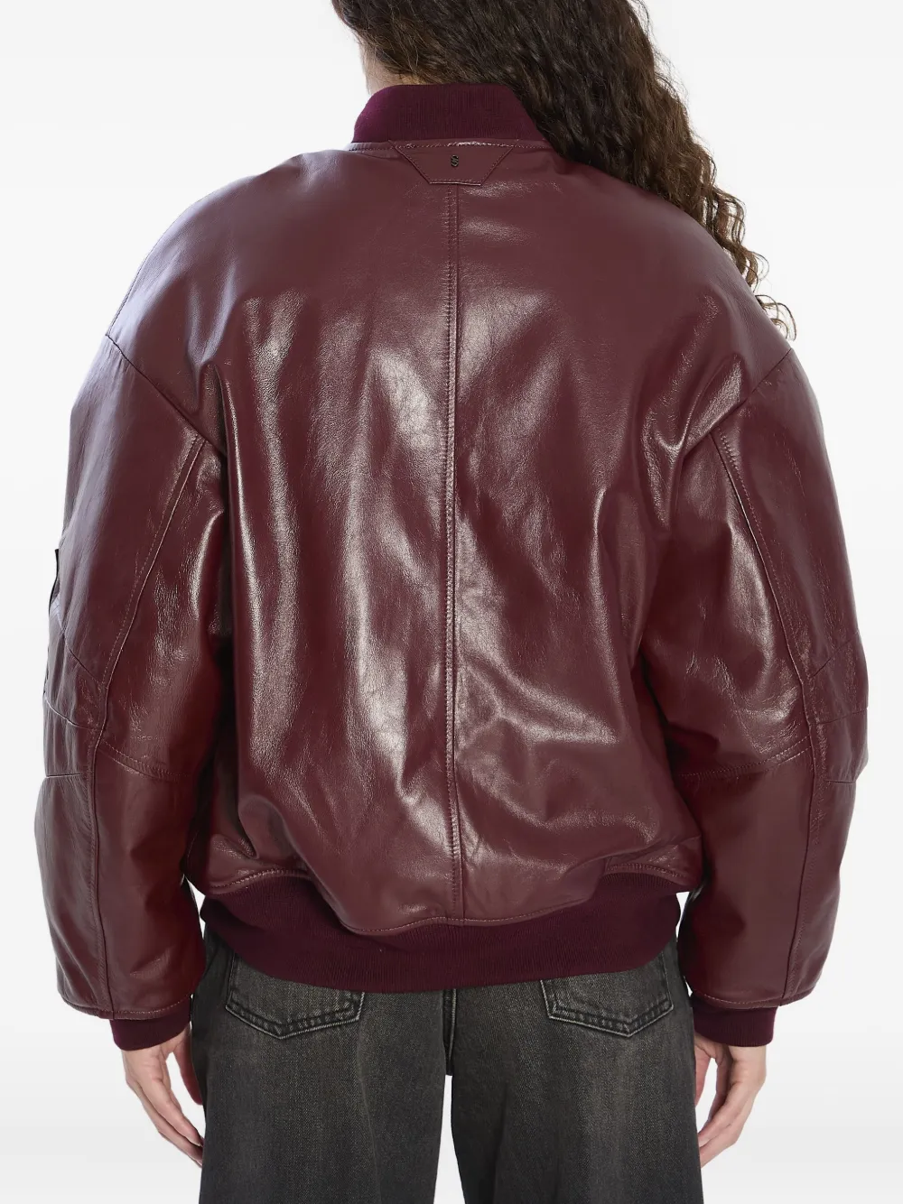 Бордовая кожаная застежка-молния с двумя бегунками, ребристые манжеты, карманы на молнии на рукавах, длинные рукава, бейсбольный воротник, спущенные плечи