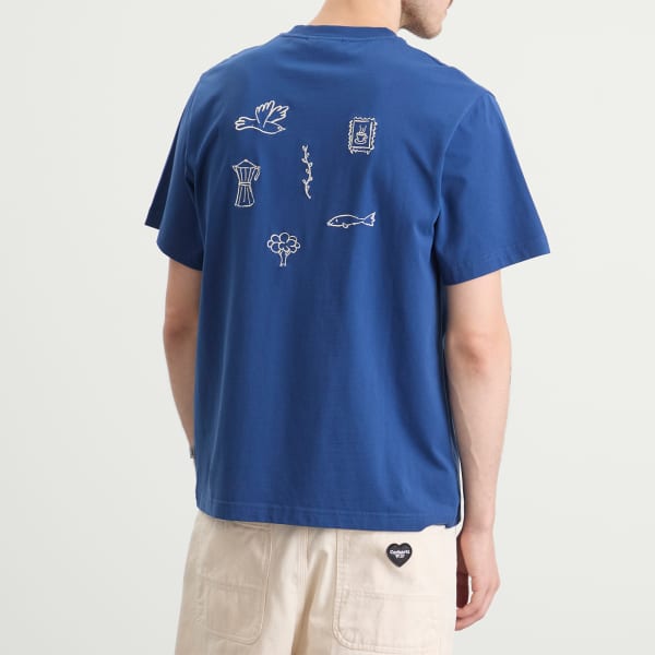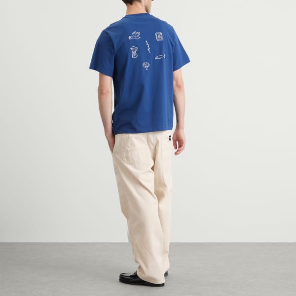 Эта футболка Foret, отдающая дань простым радостям жизни, изготовлена в Португалии из органического хлопка. На обороте вышиты замысловатые изображения, изображающие наблюдение за птицами, коллекционирование марок и рыбалку.