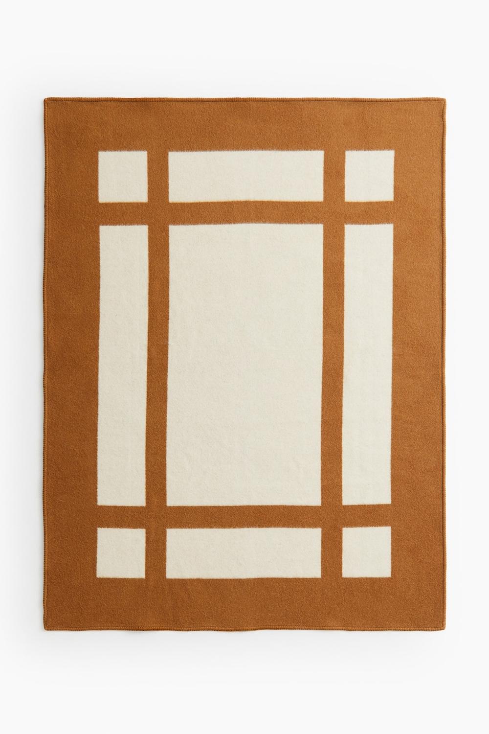 Плотное одеяло из шерстяной ткани с эффектным жаккардовым узором. Края отделаны декоративной строчкой.