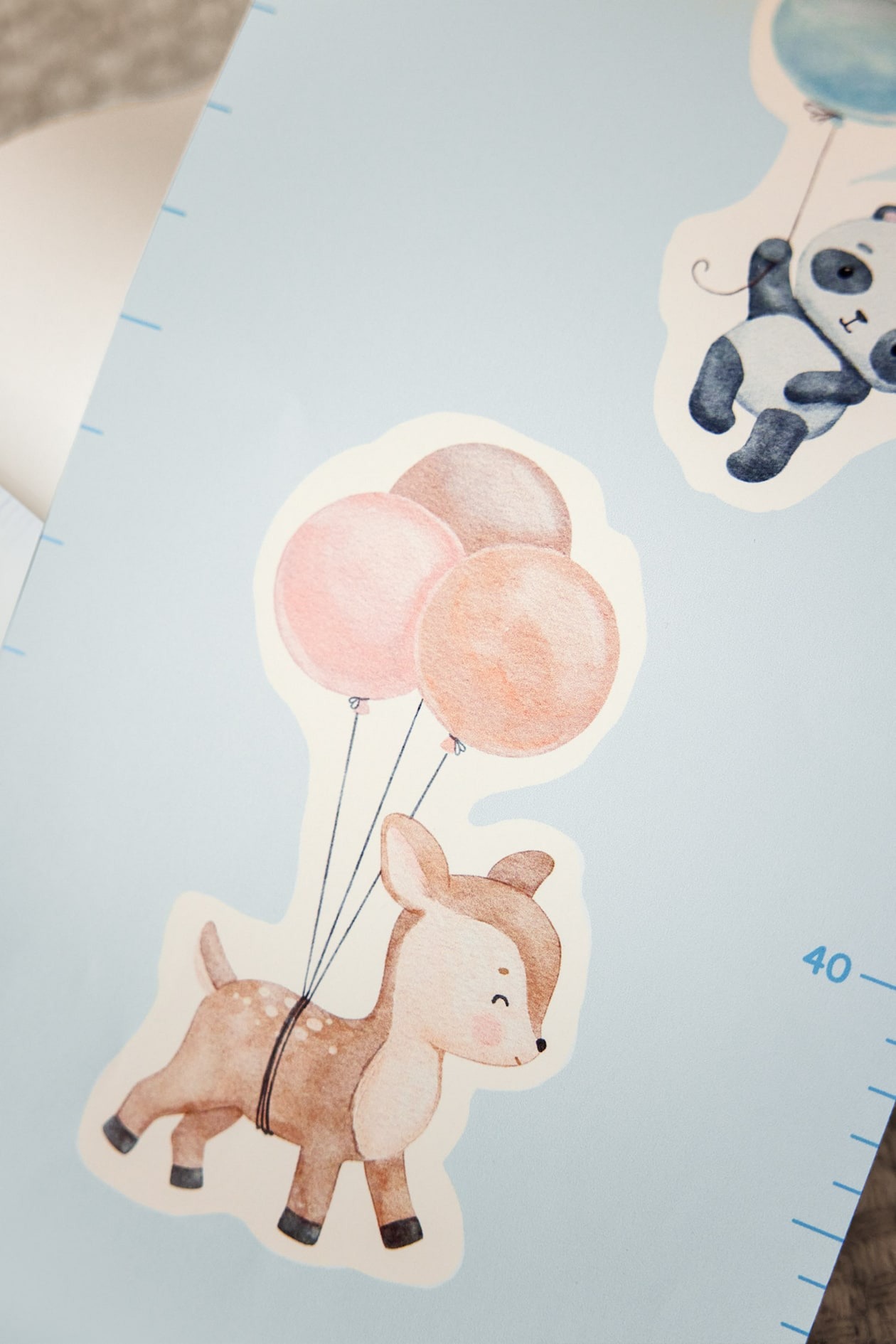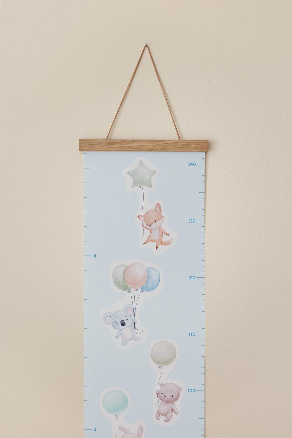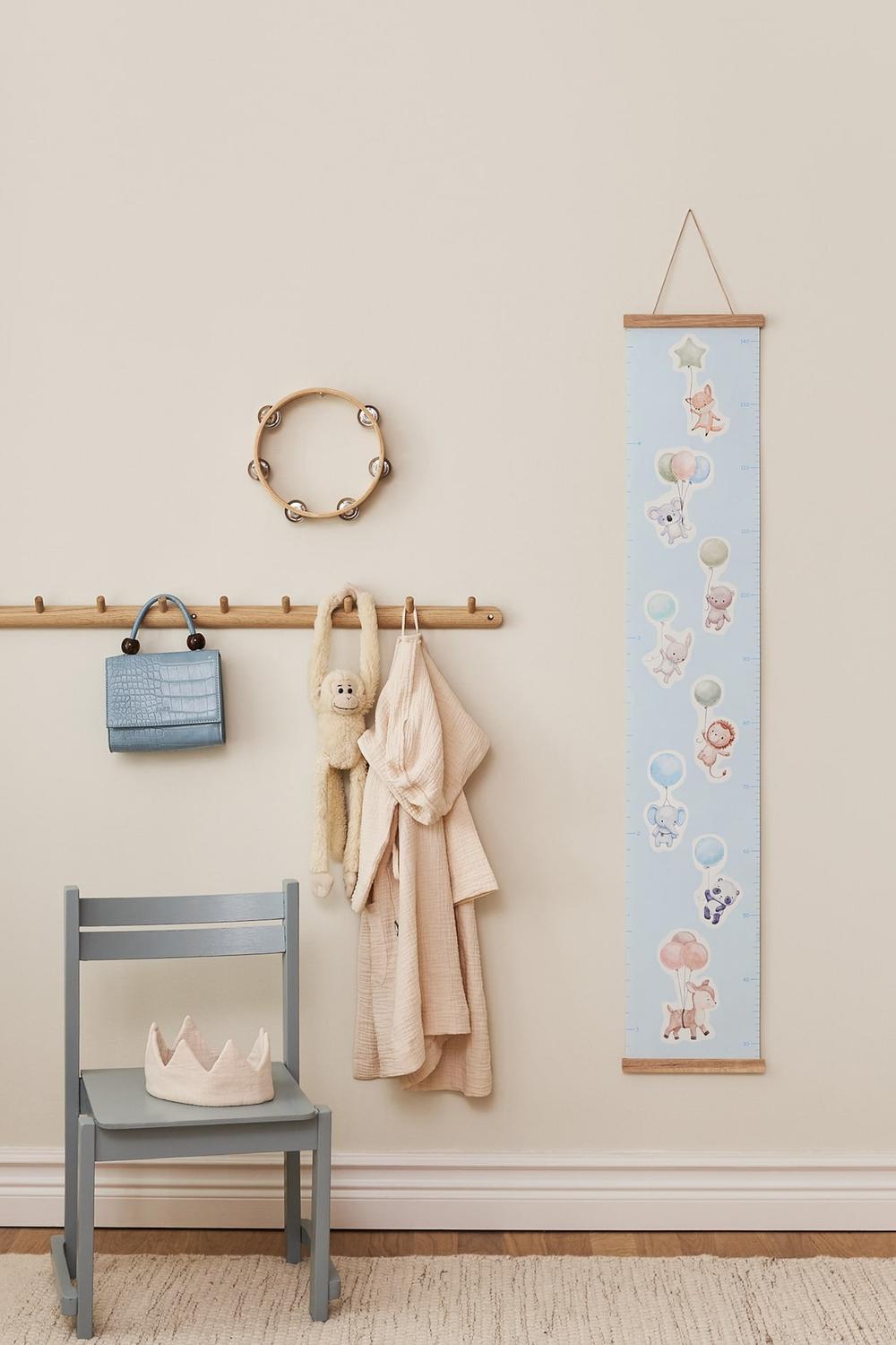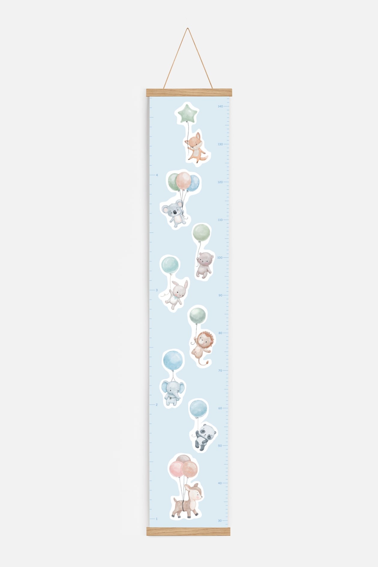 Наблюдайте, как ваш ребёнок растёт с нашей уникальной и очаровательной сантиметровой лентой. На этой сантиметровой ленте изображены животные, парящие на воздушных шарах. Вы можете делать заметки и ставить цели по мере роста ребёнка. Размер сантиметровой ленты составляет 118 x 21 см, а её рост — от 30 до 140 см. Просто повесьте её на высоте примерно 30 см от пола. В комплект входит дубовая вешалка для постеров длиной 22 см.