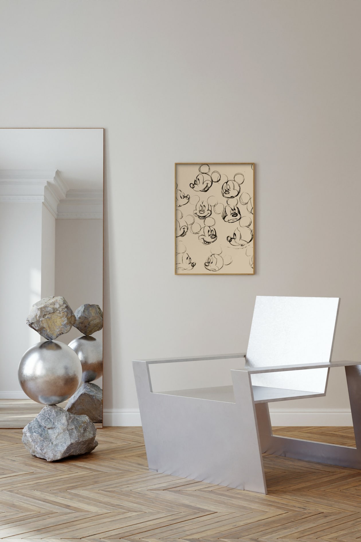 Этот постер, вдохновлённый Микки Маусом, выполнен в оригинальном стиле и напоминает о его наброске, отсылая к истокам творчества Диснея. Этот стильный выбор для поклонников и создателей мультфильмов, он органично впишется в интерьер любого дома, где ценят креативность и классический дизайн персонажей.