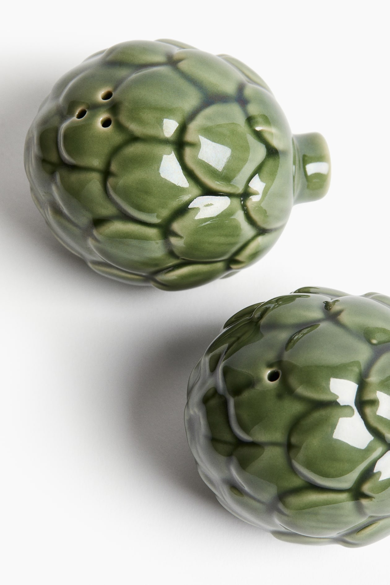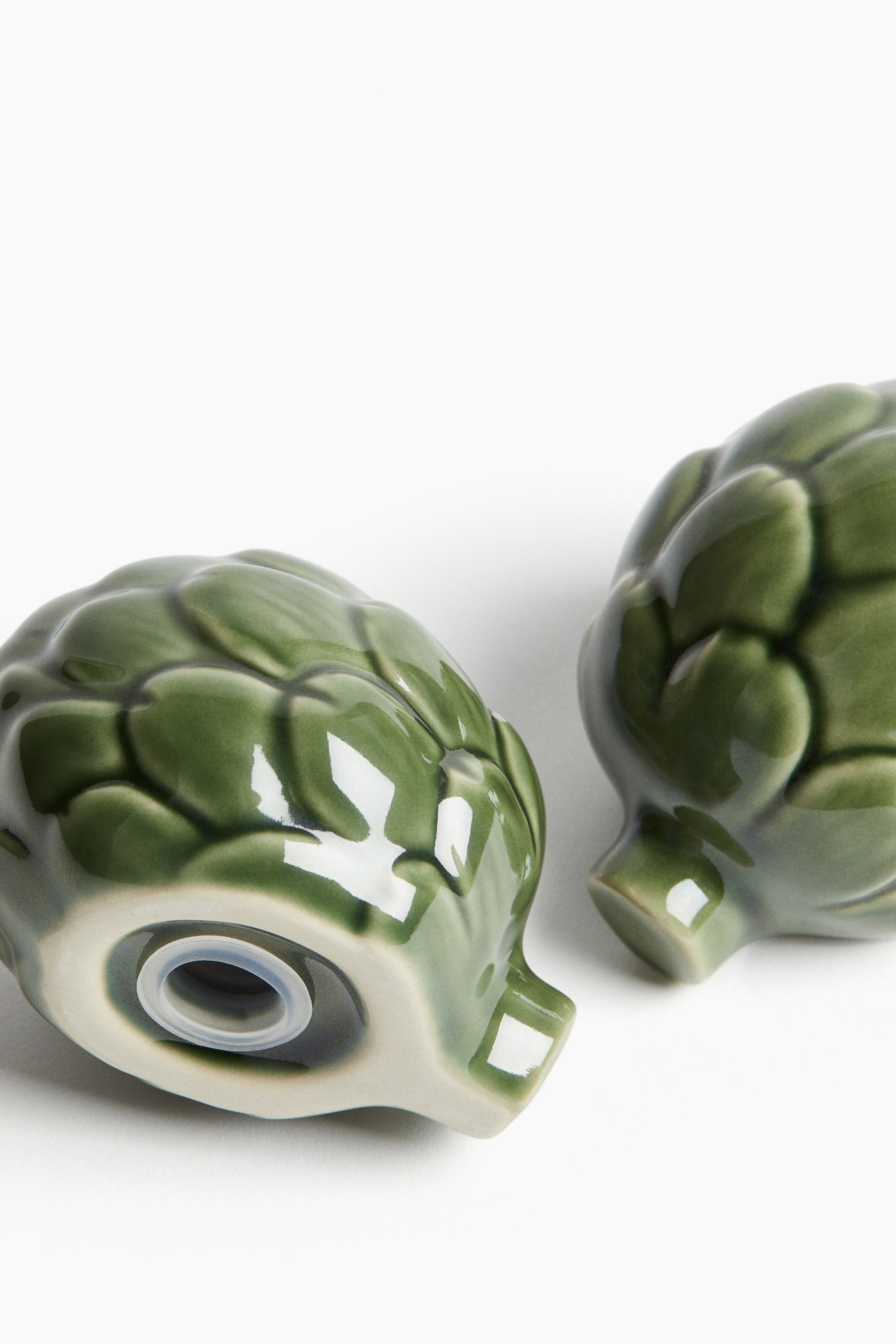 Солонка и перечница в форме помидора, изготовленные из керамики с глянцевой глазурью. Силиконовая заглушка на дне. Высота: 5 см. Ширина: 5,5 см.
